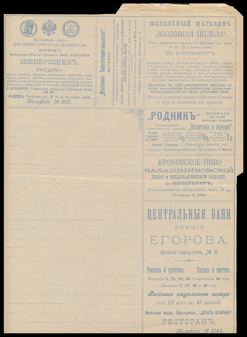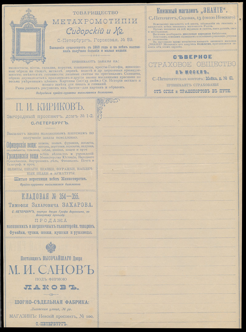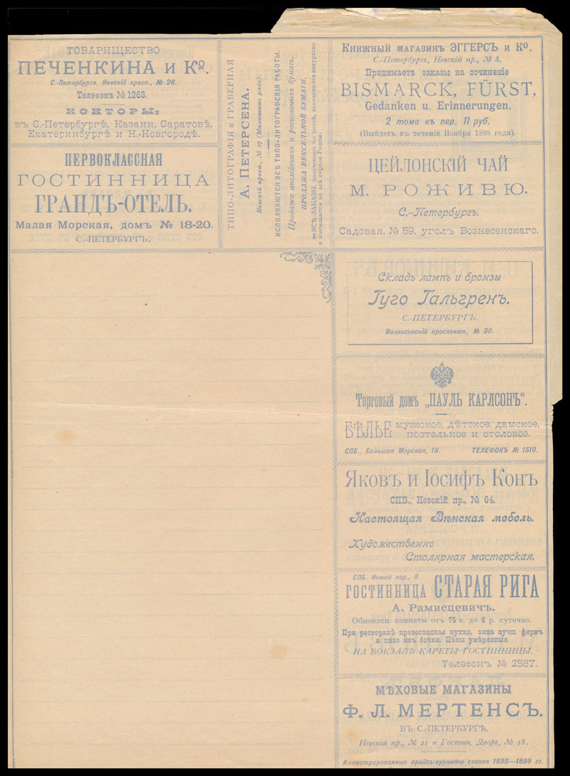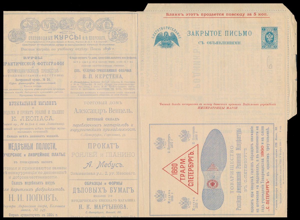1898, 7k blue, unused letter-sheet of series 6, printed in St. Petersburg, containing 31 various advertisements inside and on reverse, folded once, VF and rare in premium condition, ex-Vadim Ustinovsky, Est. $600-$700
