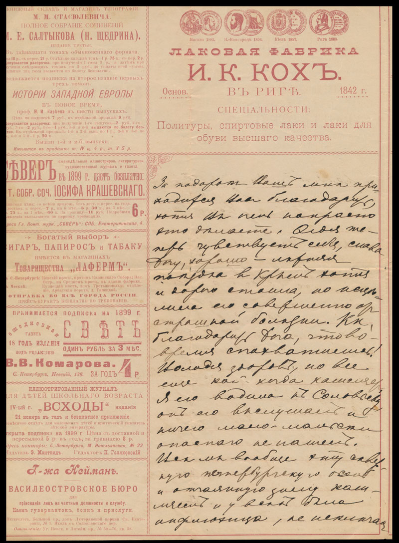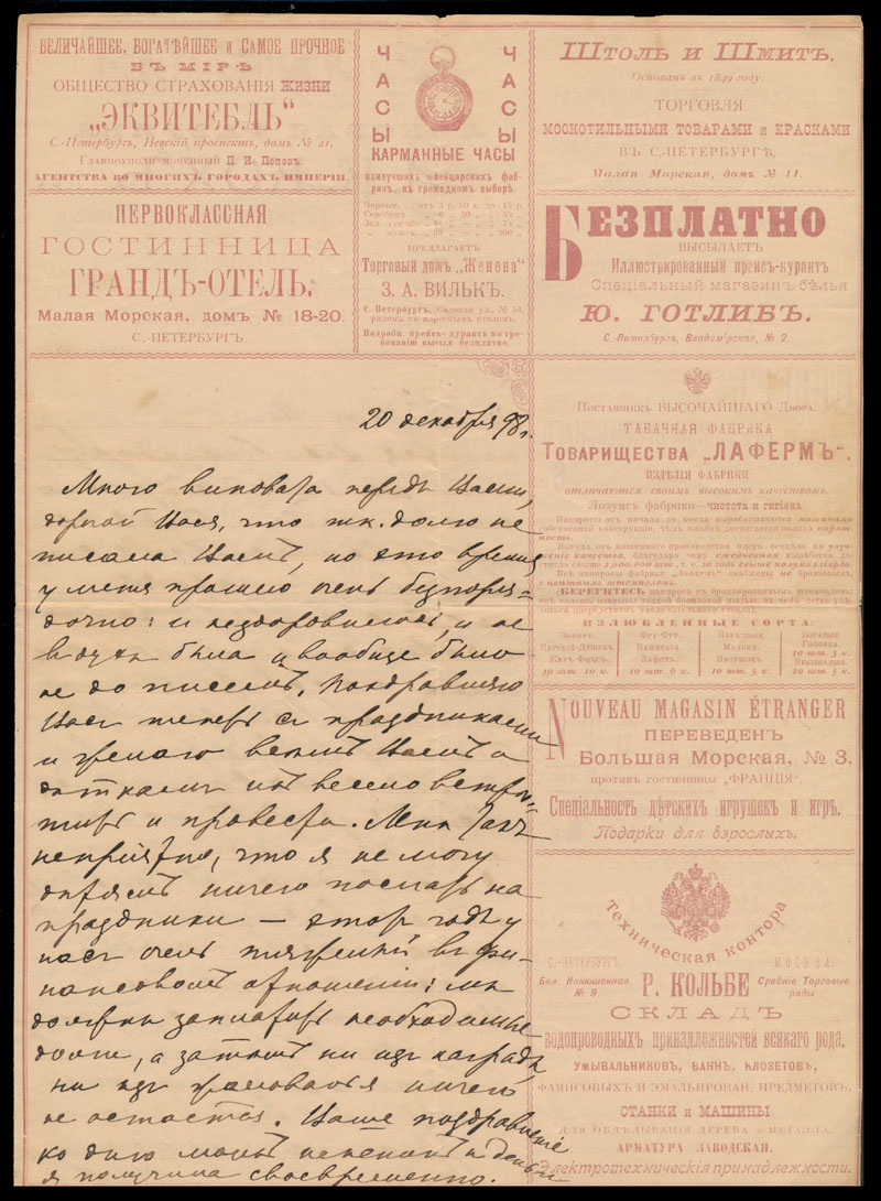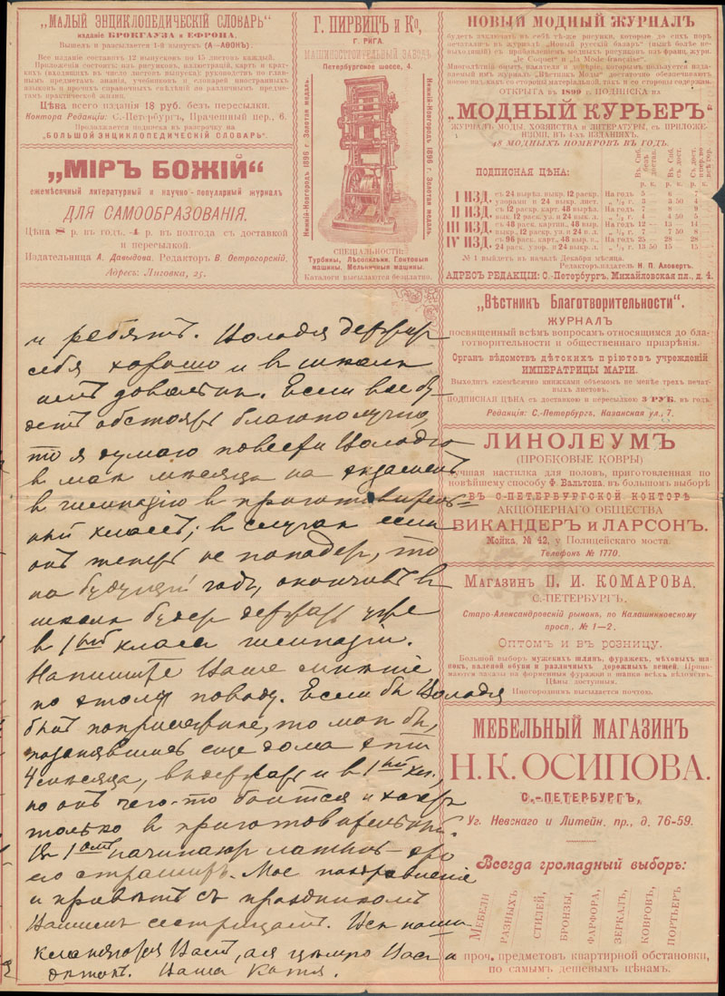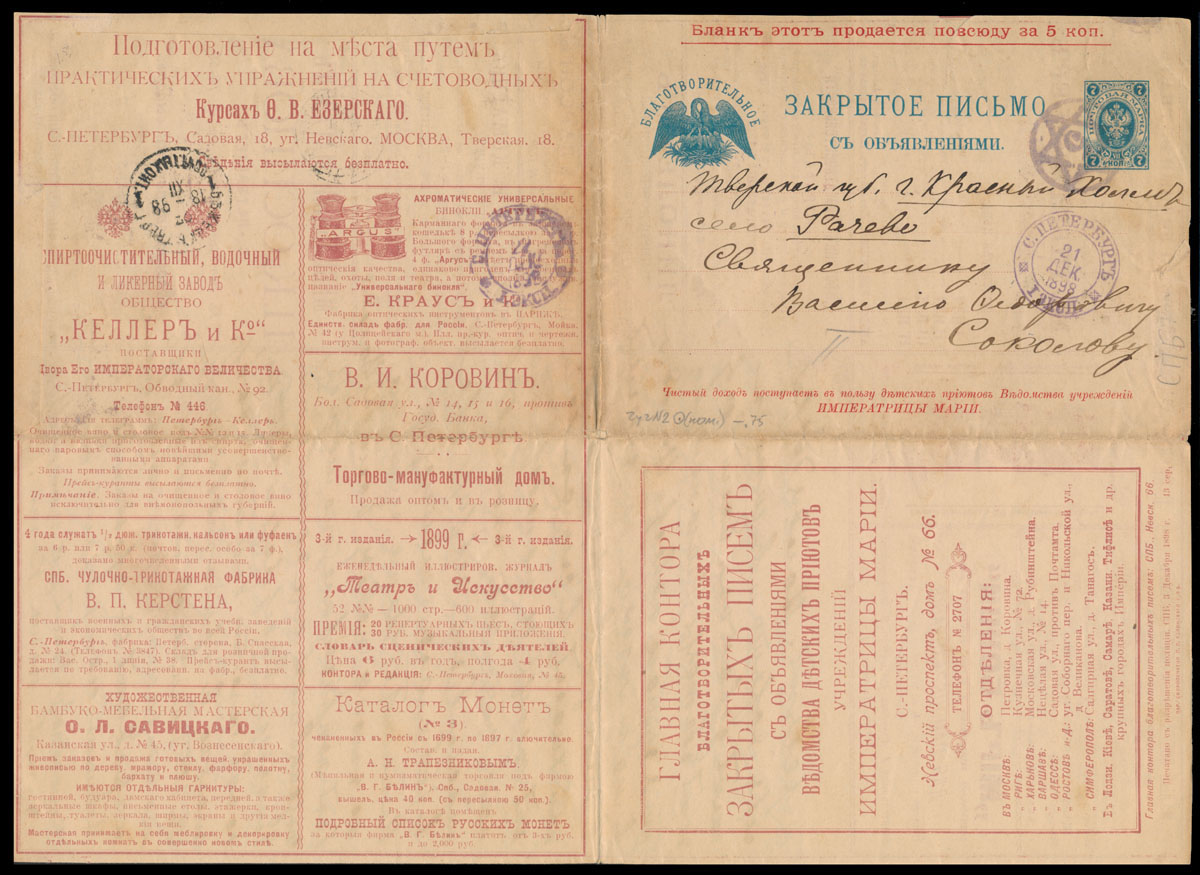 1898, 7k blue, letter-sheet of series 13, printed in St. Petersburg, containing 32 various advertisements inside and on reverse, sent from St. Petersburg to Tver Gub., minor usual conveyance flaws, F/VF, ex-Vadim Ustinovsky, Est. $600-$700