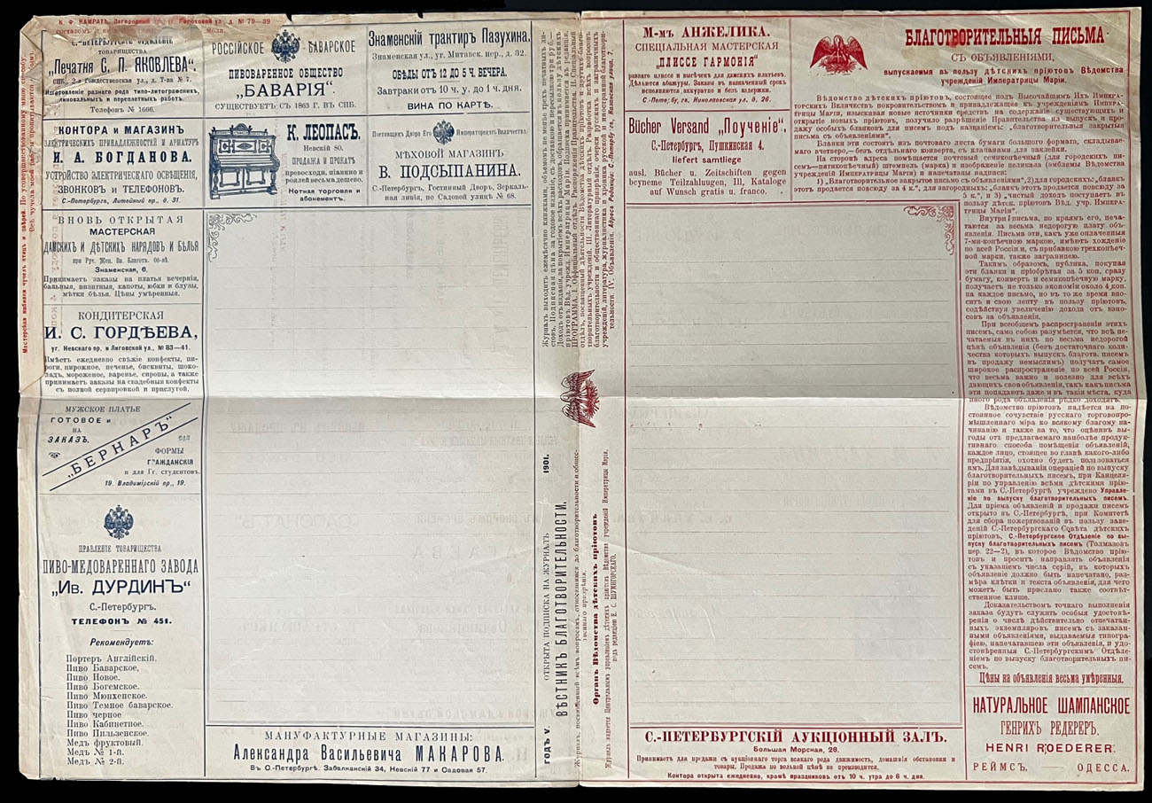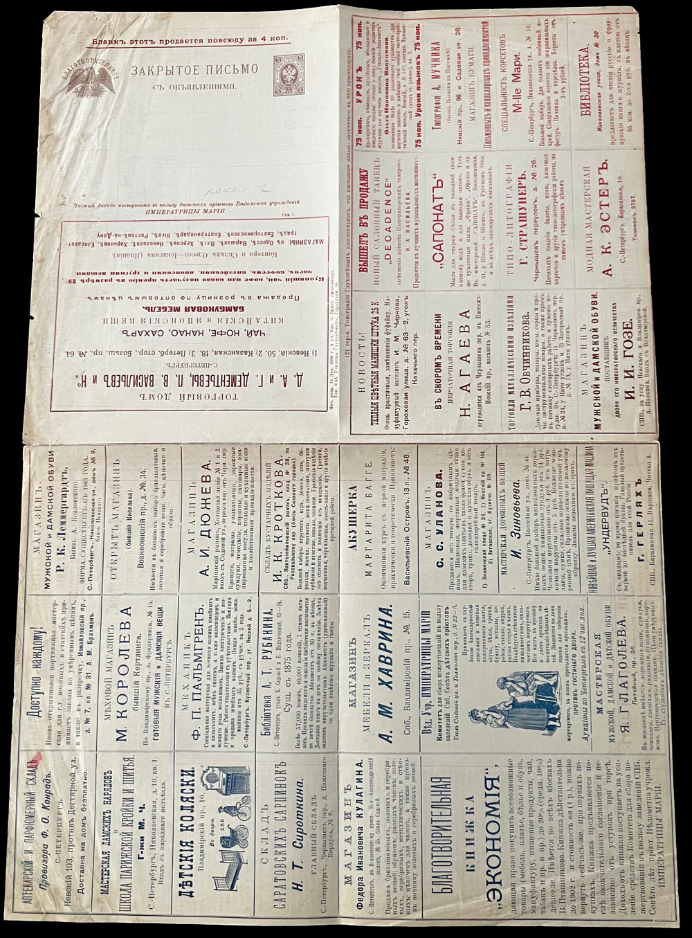 1900, 5k brown, unused letter-sheet of series 7 (local), printed in St. Petersburg, containing 51 various advertisements inside and on reverse, minor creases on front, typical folds, F/VF, Est. $600-$700