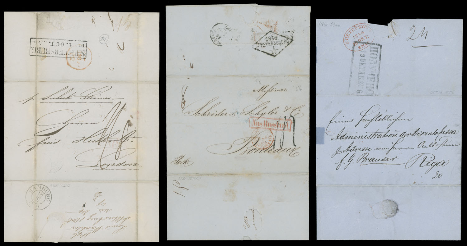 1846-56, three pre-philatelic entire letters originated from St. Petersburg, first one is Ship Mail to London via Hamburg (October 1, 1846), two others addressed to Bordeaux (January 25, 1856) and to Riga (October 16, 1856), nice variety of pre-philatelic markings, usual folds, F/VF, Est. $200-$250