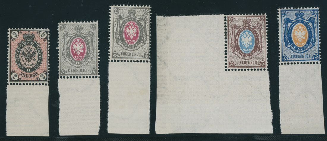 1875-79, Coat of Arms, 2k-20k, complete set of five printed on horizontally laid paper, all with bottom sheet margins (10k with corner margin), full OG, NH, VF, C.v. $558, Est. $400-$500 , Scott #26-30