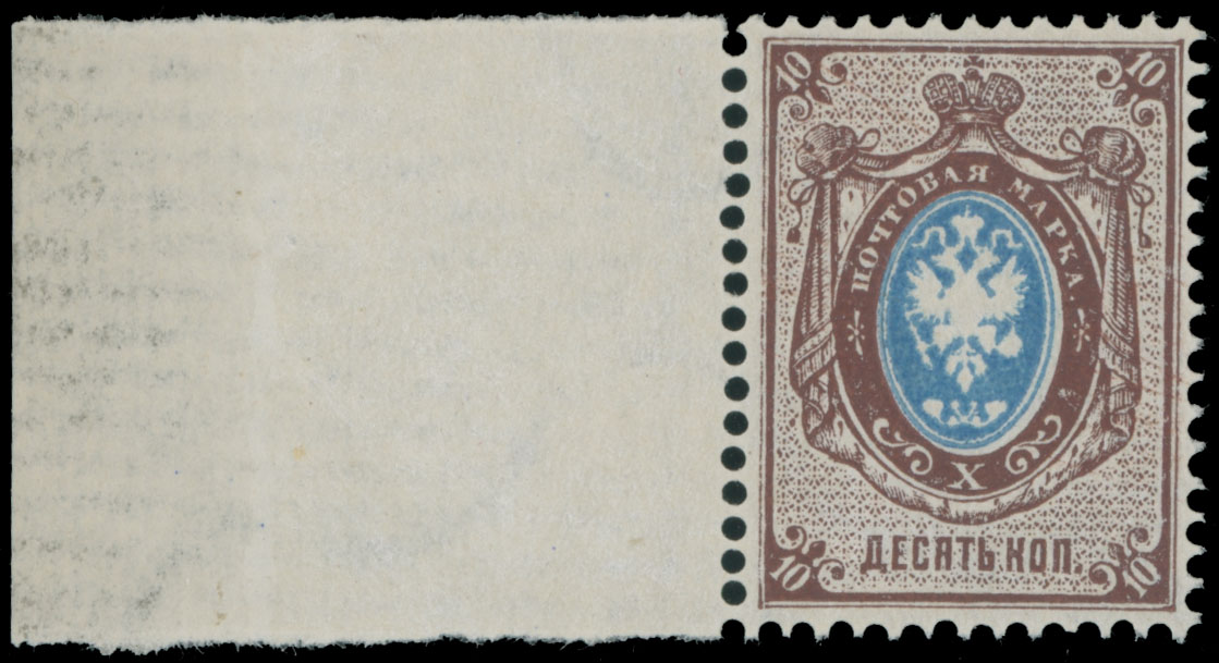 1875, Coat of Arms, 10k brown and blue, left sheet margin single printed on horizontally laid paper, ”DESAT’ KOP” variety, full OG, NH, VF, C.v. $210 for a common stamp, Est. $150-$180 , Scott #29 var