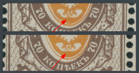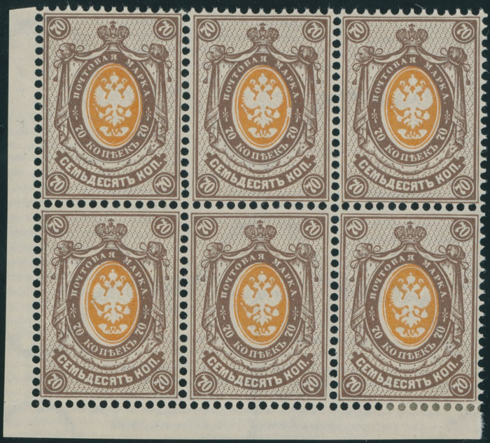 1883, Coat of Arms, 70k brown and orange, bottom left margin block of six (3×2), printed on horizontally laid paper, top left stamp has Posthorns broken, while bottom left has Posthorns joined, nice and a spectacular item, full OG, NH or LH (bottom right stamp), VF, C.v. $742++, Est. $400-$500, Scott #38, var