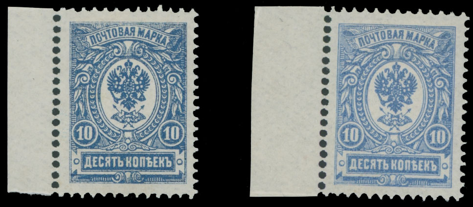 1908, two plate proofs of 10k in blue or light blue, perforation 14½x15, printed on wove paper without varnish lines, each stamp with 3 instead of 2 lines of inner oval and with top ribbon curls different from an issued stamp, both with no gum as produced, VF and rare, Est. $2,000-$2,500, Scott #79