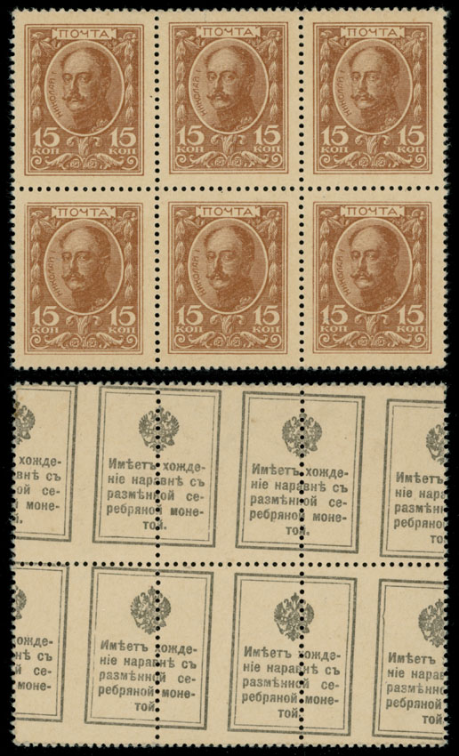 1915, Money stamps, Nicholas I 15k brown, block of six (3×2) with reversal text strongly misplaced, no gum as issued, NH, VF, Est. $200-$250 , Scott #106 var