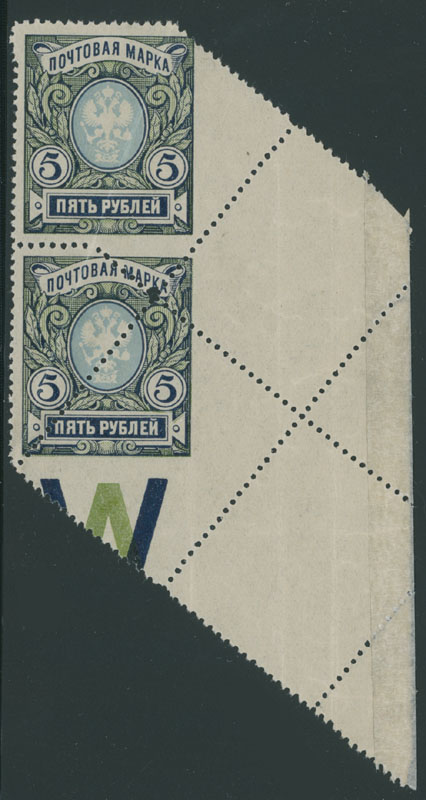 1915-17, Coat of Arms, 5r dark blue, green and light blue, perforation 12½, strongly misperforated right sheet margin vertical pair due to foldover, full OG, NH, VF and a spectacular item, Est. $300-$400 , Scott #108b
