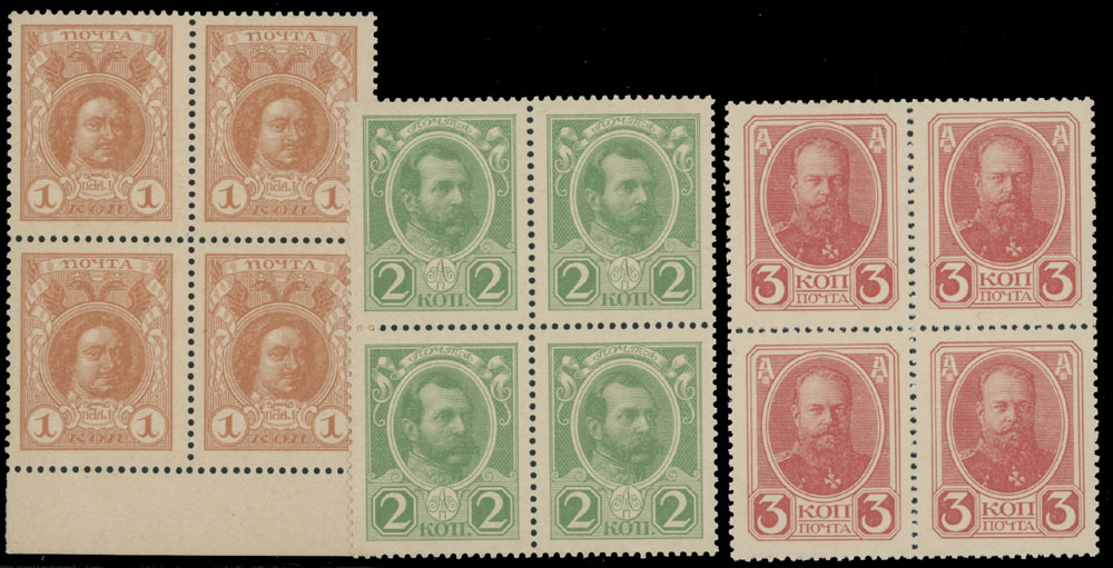 1916-17, Money stamps of 1k orange, 2k green and 3k red, complete set in blocks of four, text is on reverse, no gum as issued, NH, VF, C.v. $420, Est. $400-$450 , Scott #114-16