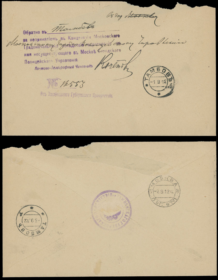 1912, official envelope from Tambov Gub. Administration, sent free-frank to Moscow Police Department, undelivered and returned to sender with 6-line violet cachet reads: ”Return to Tambov. Due to unacceptable in the office of the Moscow Mayor…”, some tears, still F/VF, rare item, Est. $200-$250