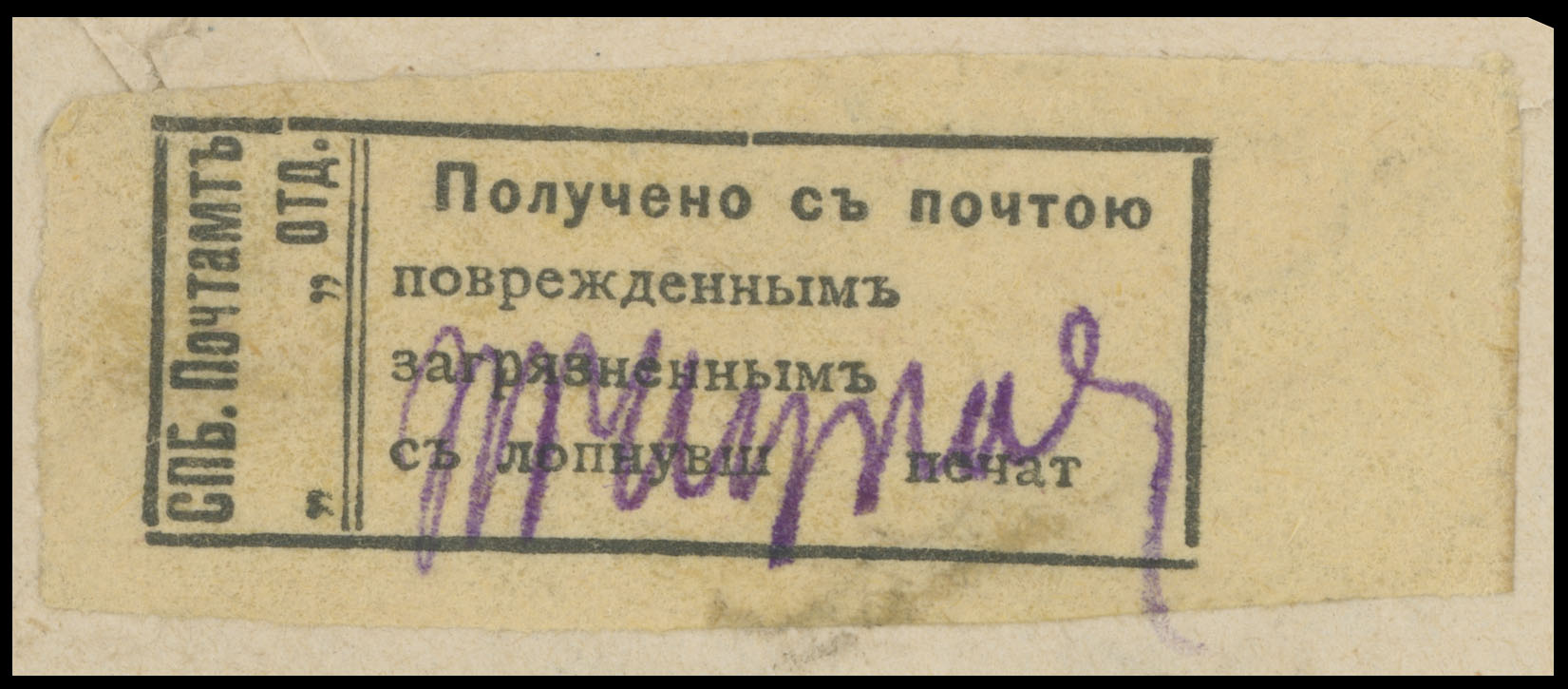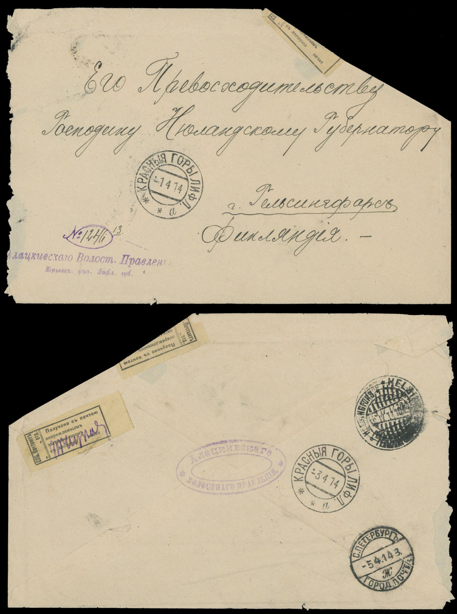 OFFICIALLY SEALED COVER: 1914 (April 3 – Julian Calendar), official envelope sent free-frank from Yuriev Uezd of Lifland Gub., addressed to Nuland Governor in Helsingfors (Helsinki), severe damages, two black text labels on straw paper reads: ”St. Petersburg General Post Office. Received by Mail Damaged”, St. Petersburg transit (5.4.14) and Helsingfors receiver (19.IV.14 Gregorian Calendar), collectible condition and extremely rare, Est. $500-$600