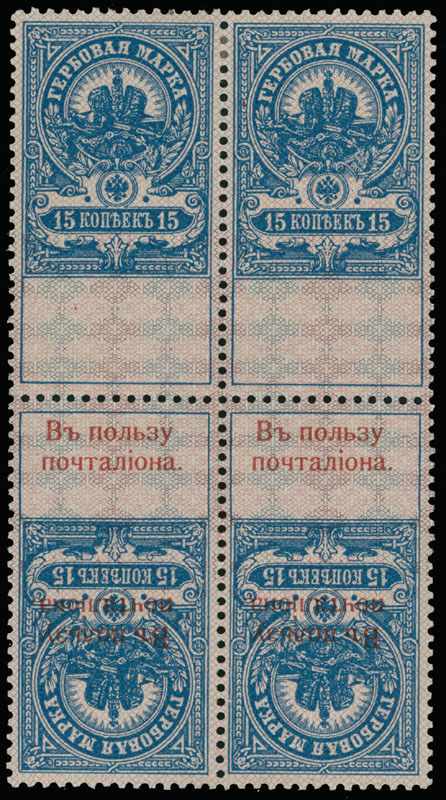 1909, red overprint on revenue stamp of 15k blue and rose, block of four, top stamps without overprint, while bottom ones bearing double overprint (one inverted) due to amazing overprint shift, full OG, NH (bottom stamps) or LH, VF and extremely rare, according to our records the only block of four and vertical pair of this error are known, Raritan Stamps guarantee, Est. $8,000-$10,000