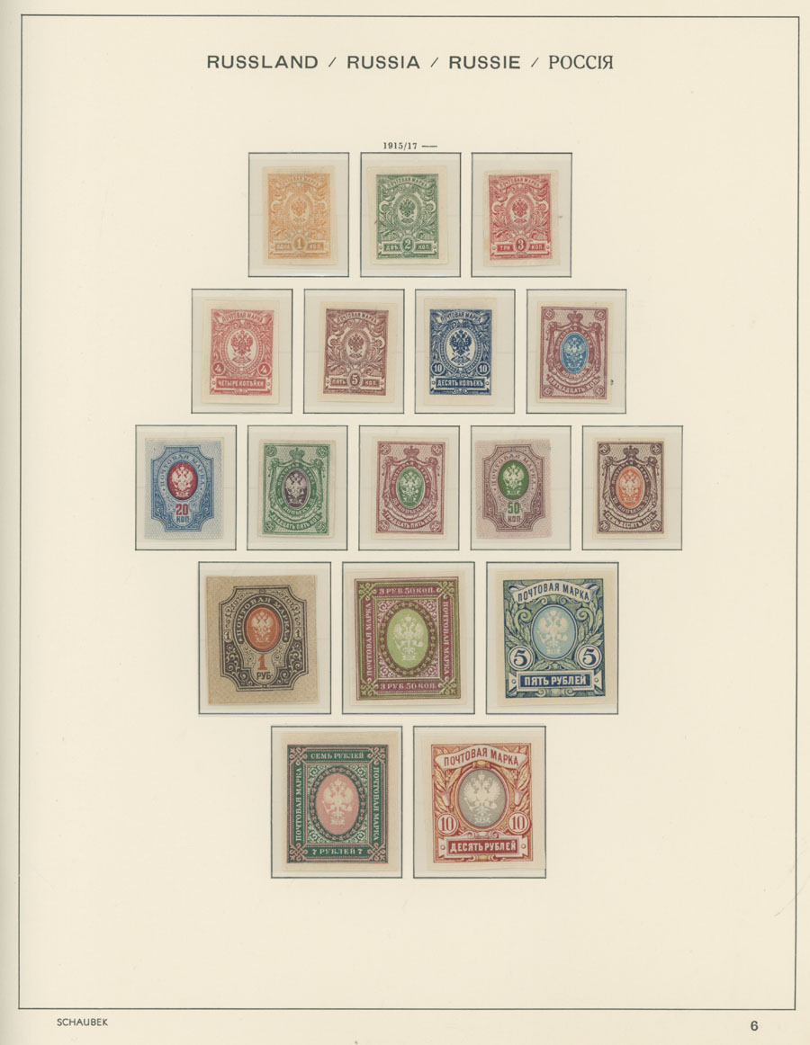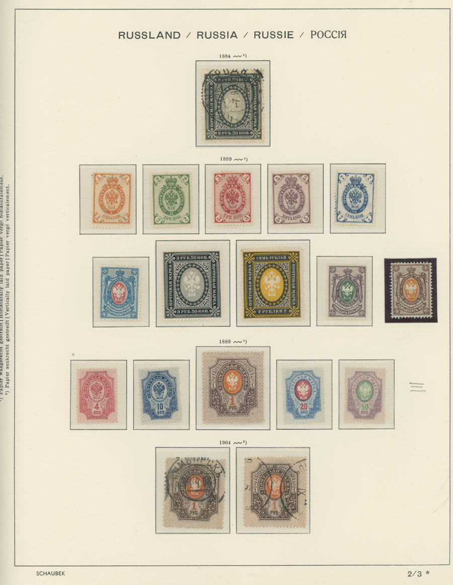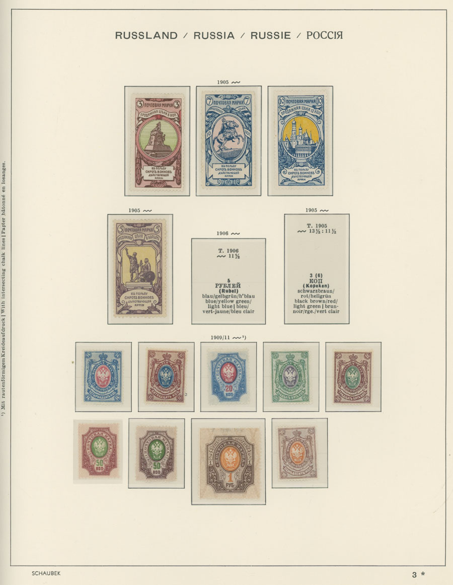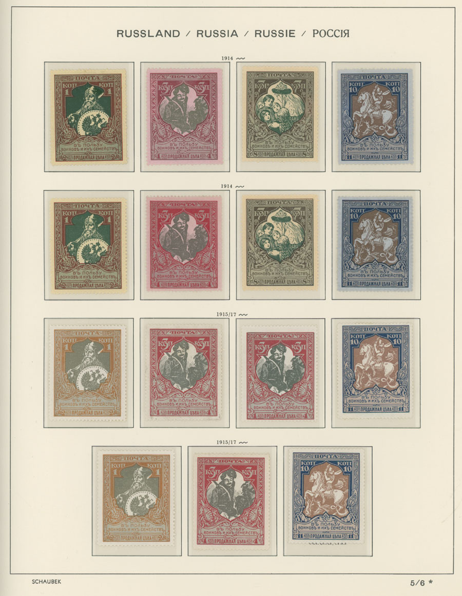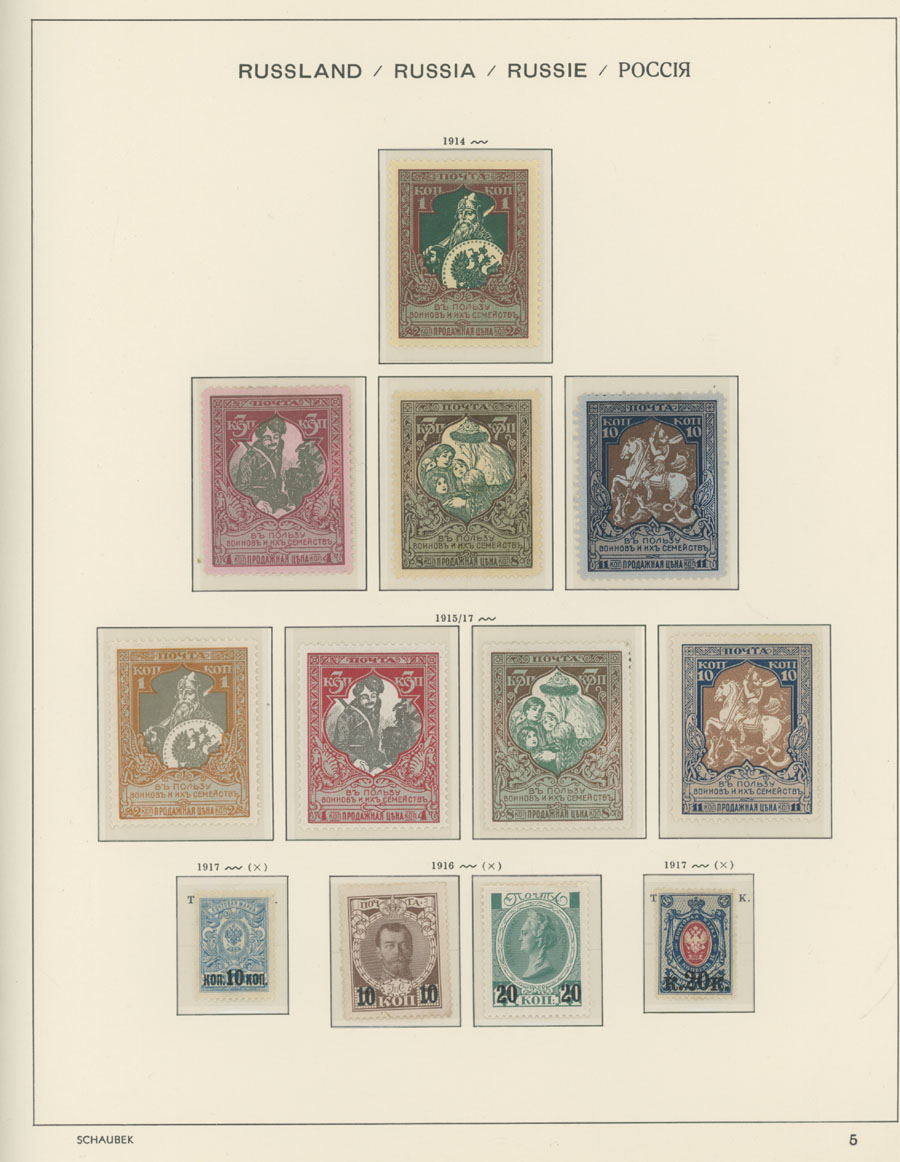 IMPERIAL RUSSIA AND R.S.F.S.R. COLLECTION ON SCHAUBEK PAGES: 1857-1923, several hundred mint and used stamps, starting with No.1 with TPO cancellation, then various sets and singles on paper without watermark or horizontally/vertically laid paper (some mixed up and valuable stamps generally used), however includes nice No.53-54, practically complete 55-70, 71, mint Romanov Dynasty with all money-stamps, complete later issues on wove paper with varnish lines even with 10k light blue (No.79a), Soviet Russia unit is apparently complete. The Collection represents semi-postal issues for the period (no Philately for the Labor); overall mixed condition on used items, full/part of OG on others, F/VF, overall high potential unit, Est. $1,200-$1,500