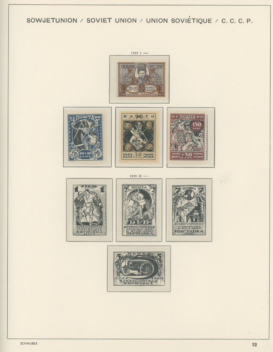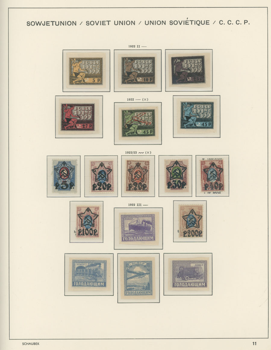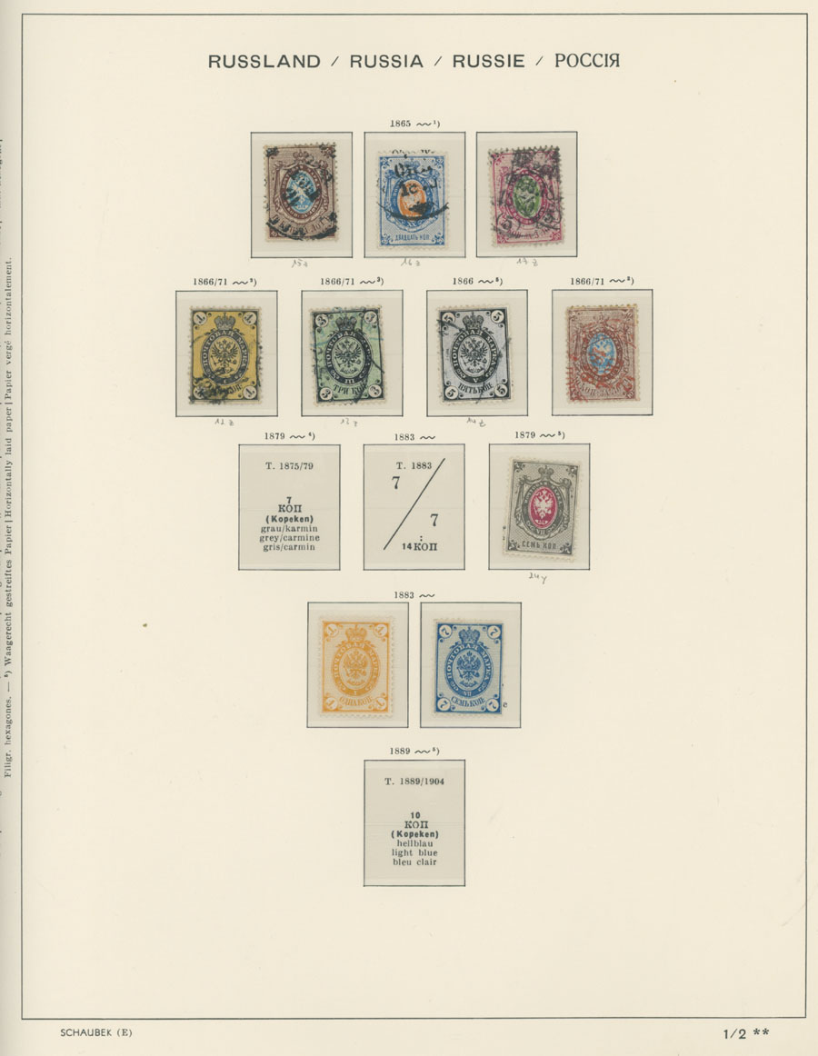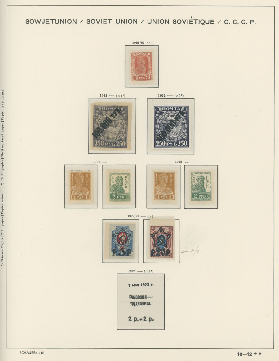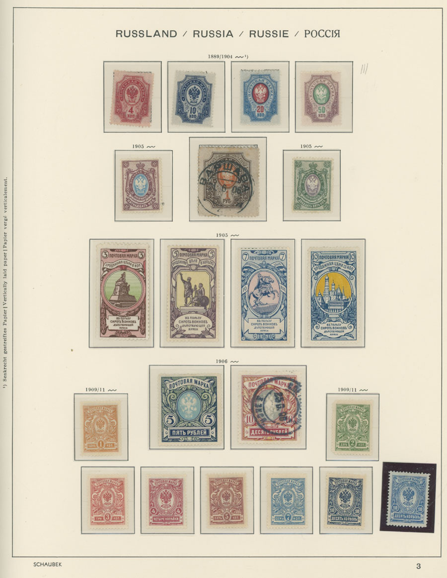 IMPERIAL RUSSIA AND R.S.F.S.R. COLLECTION ON SCHAUBEK PAGES: 1857-1923, several hundred mint and used stamps, starting with No.1 with TPO cancellation, then various sets and singles on paper without watermark or horizontally/vertically laid paper (some mixed up and valuable stamps generally used), however includes nice No.53-54, practically complete 55-70, 71, mint Romanov Dynasty with all money-stamps, complete later issues on wove paper with varnish lines even with 10k light blue (No.79a), Soviet Russia unit is apparently complete. The Collection represents semi-postal issues for the period (no Philately for the Labor); overall mixed condition on used items, full/part of OG on others, F/VF, overall high potential unit, Est. $1,200-$1,500