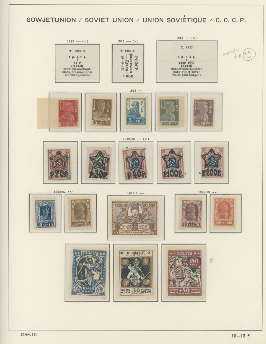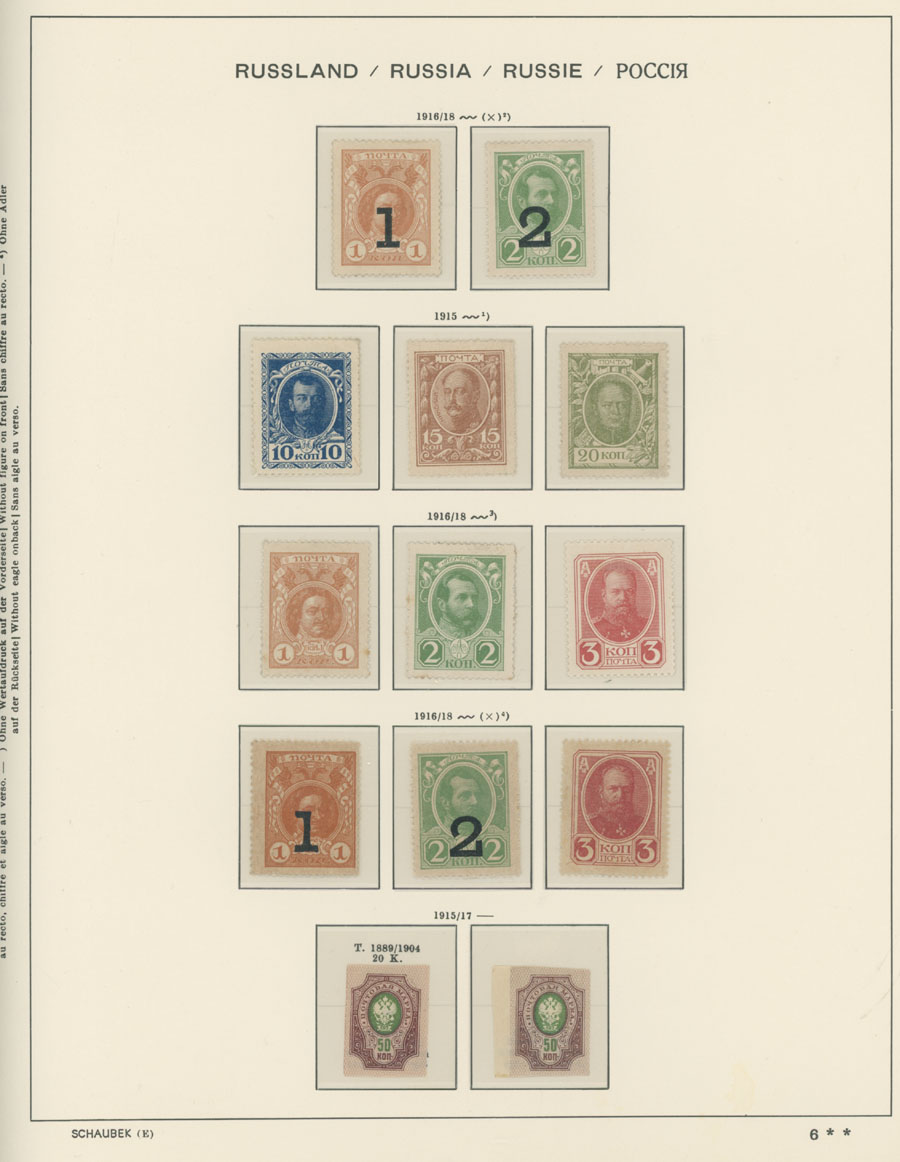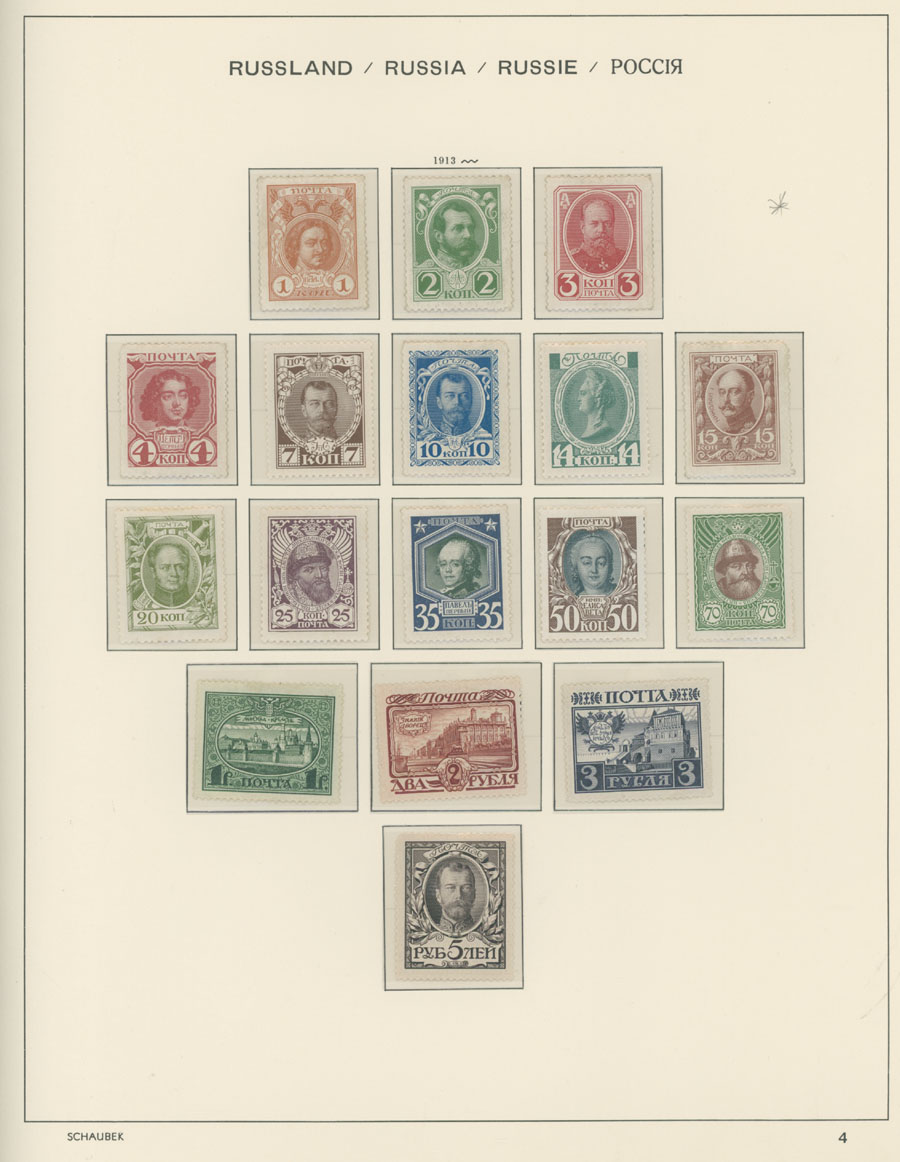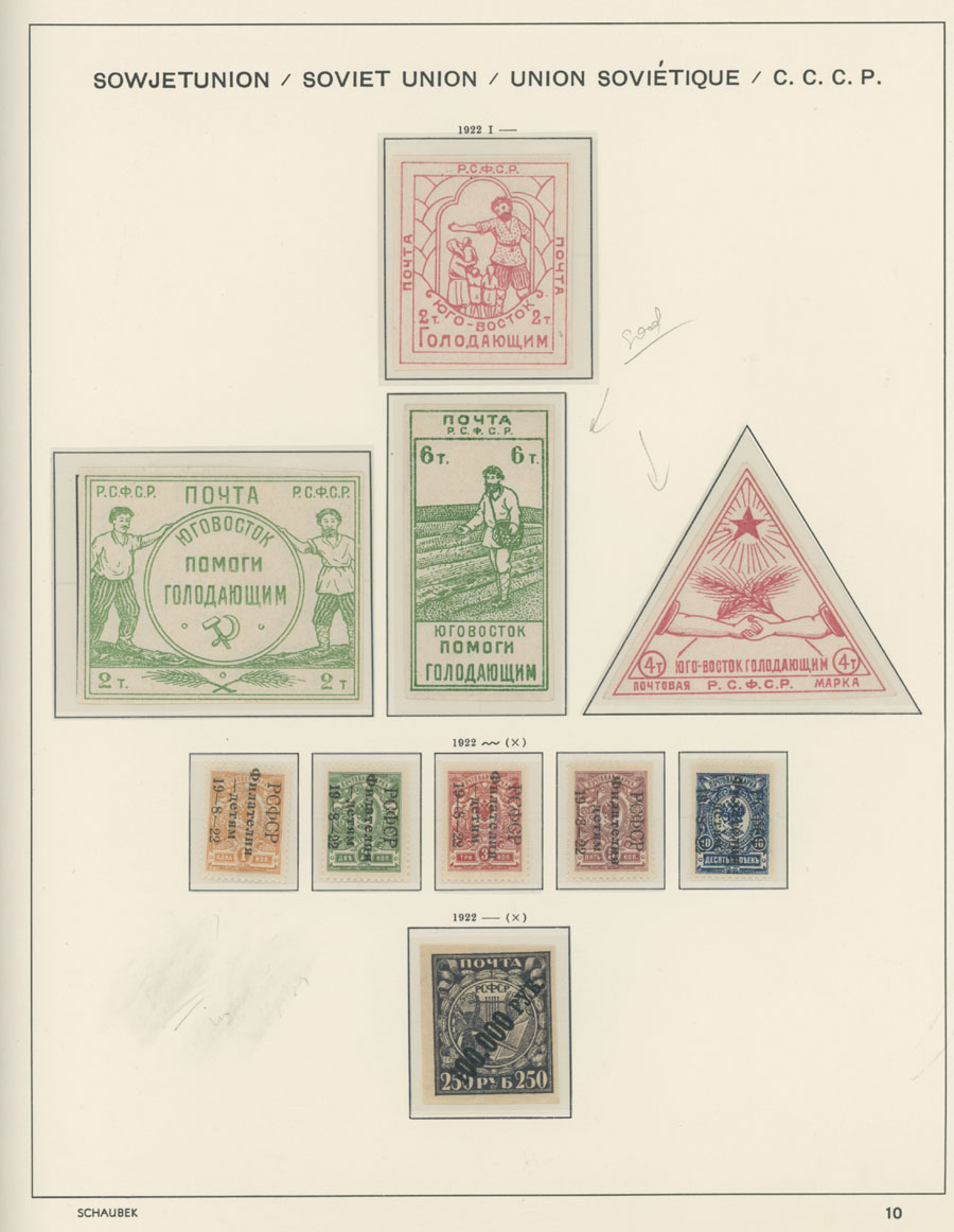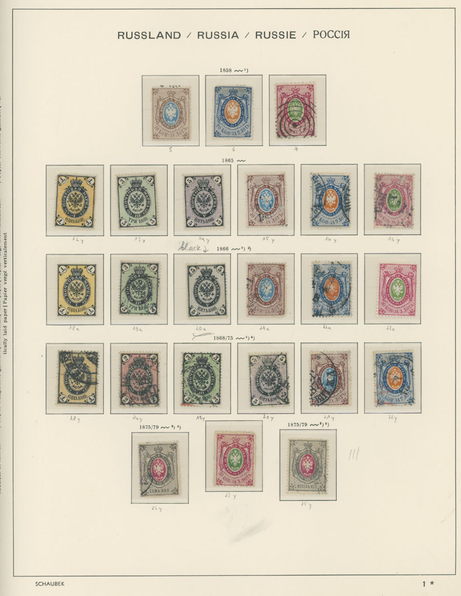 IMPERIAL RUSSIA AND R.S.F.S.R. COLLECTION ON SCHAUBEK PAGES: 1857-1923, several hundred mint and used stamps, starting with No.1 with TPO cancellation, then various sets and singles on paper without watermark or horizontally/vertically laid paper (some mixed up and valuable stamps generally used), however includes nice No.53-54, practically complete 55-70, 71, mint Romanov Dynasty with all money-stamps, complete later issues on wove paper with varnish lines even with 10k light blue (No.79a), Soviet Russia unit is apparently complete. The Collection represents semi-postal issues for the period (no Philately for the Labor); overall mixed condition on used items, full/part of OG on others, F/VF, overall high potential unit, Est. $1,200-$1,500