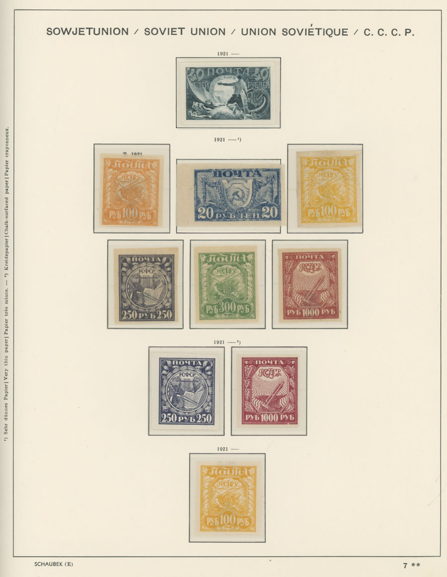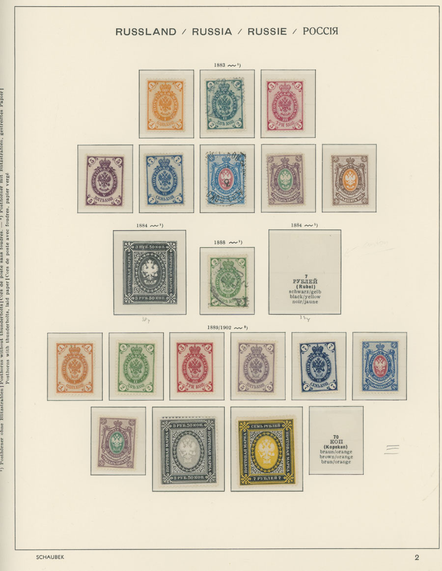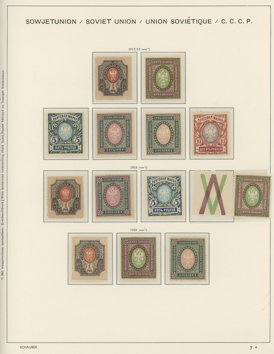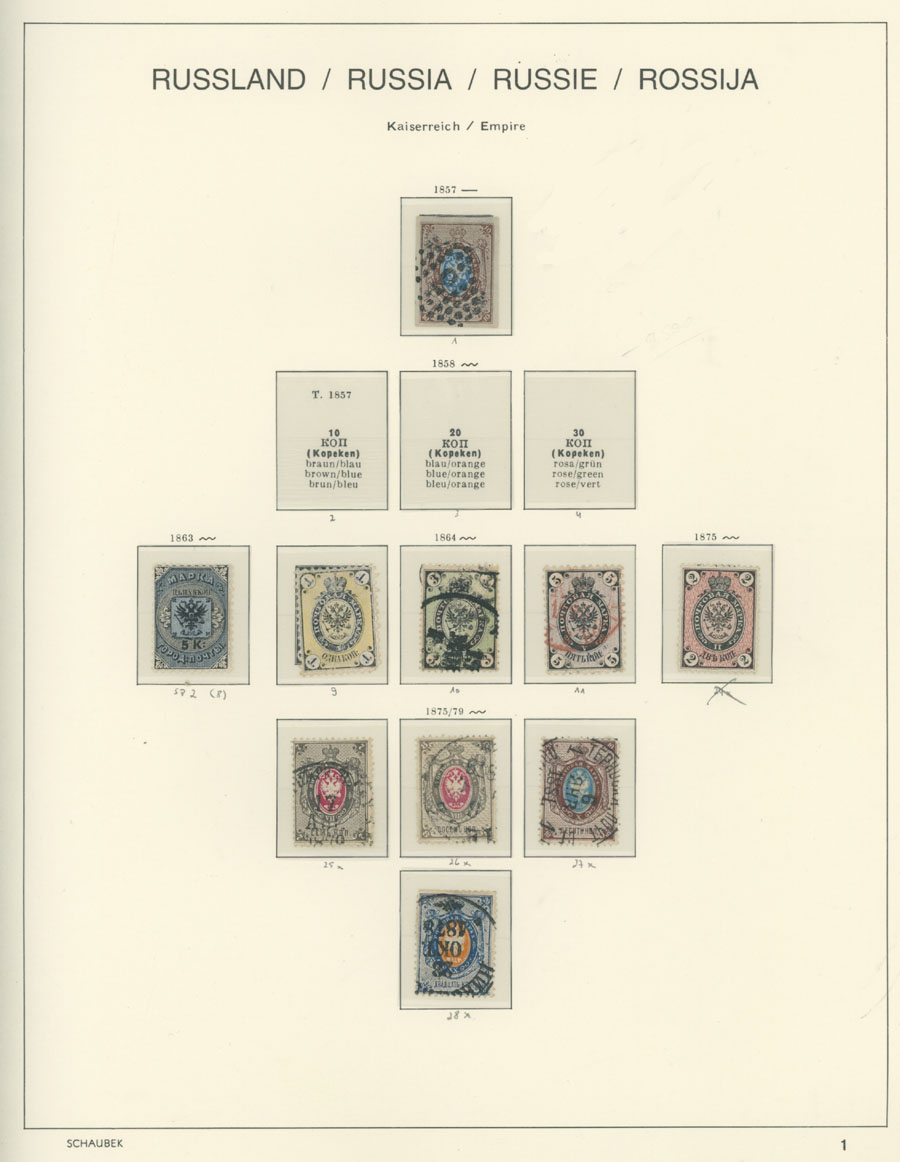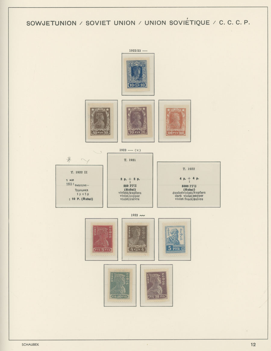 IMPERIAL RUSSIA AND R.S.F.S.R. COLLECTION ON SCHAUBEK PAGES: 1857-1923, several hundred mint and used stamps, starting with No.1 with TPO cancellation, then various sets and singles on paper without watermark or horizontally/vertically laid paper (some mixed up and valuable stamps generally used), however includes nice No.53-54, practically complete 55-70, 71, mint Romanov Dynasty with all money-stamps, complete later issues on wove paper with varnish lines even with 10k light blue (No.79a), Soviet Russia unit is apparently complete. The Collection represents semi-postal issues for the period (no Philately for the Labor); overall mixed condition on used items, full/part of OG on others, F/VF, overall high potential unit, Est. $1,200-$1,500