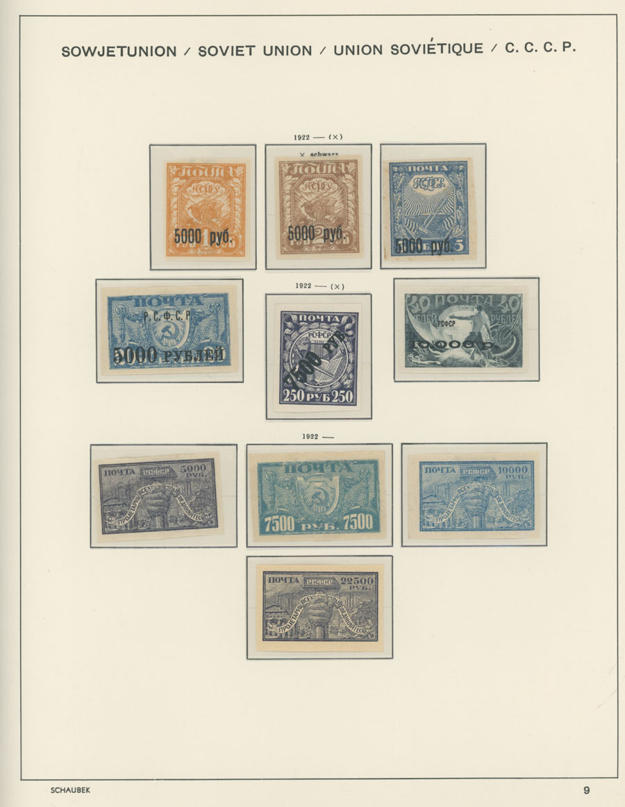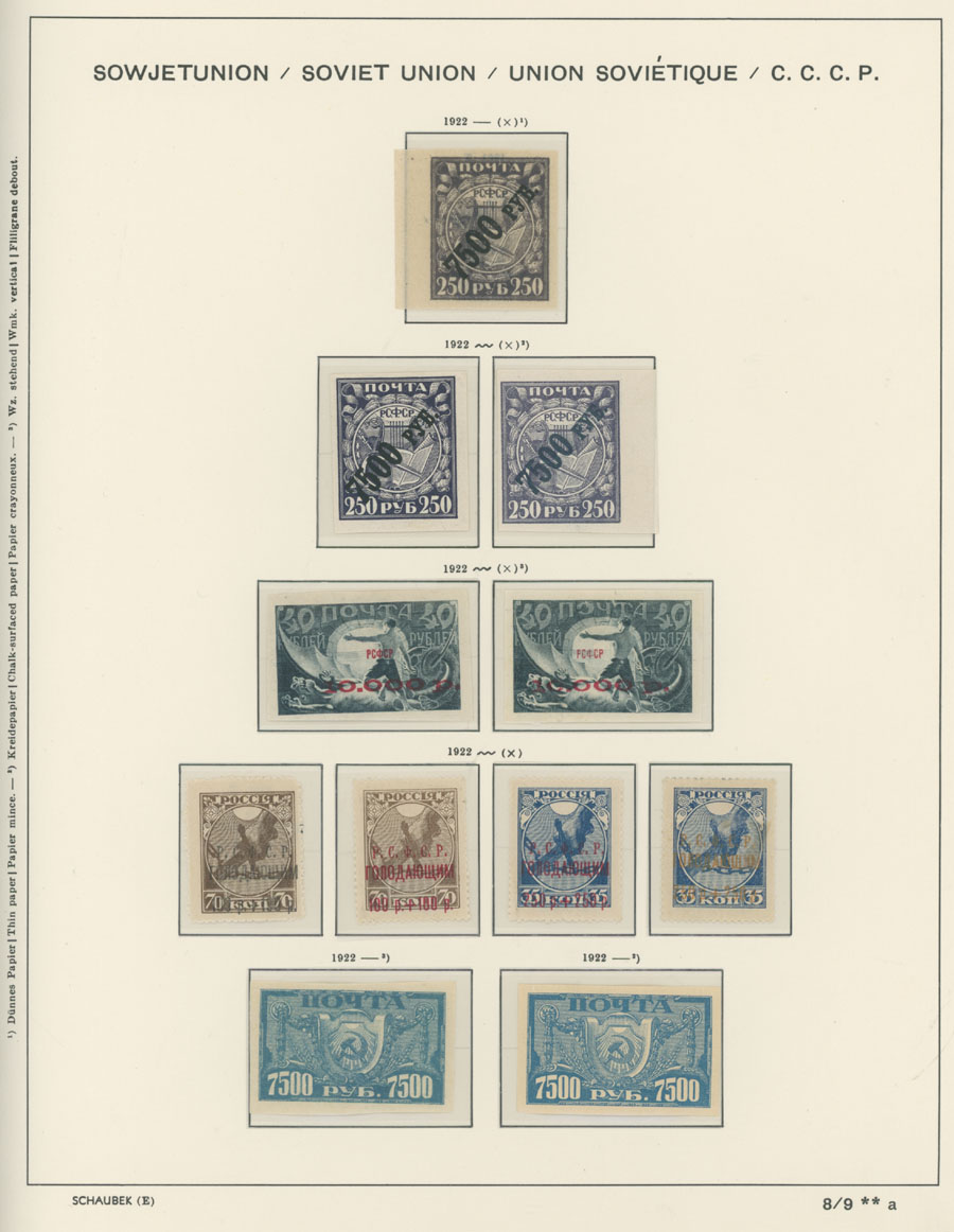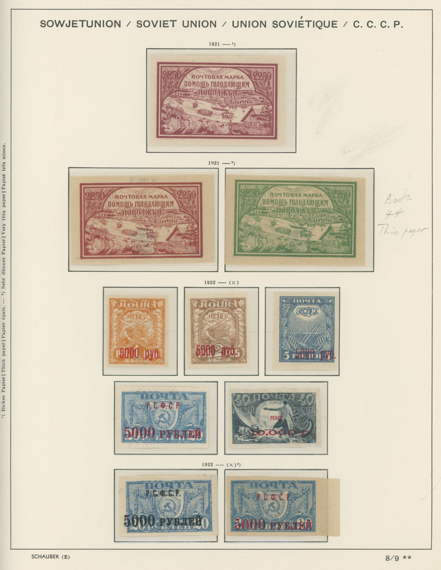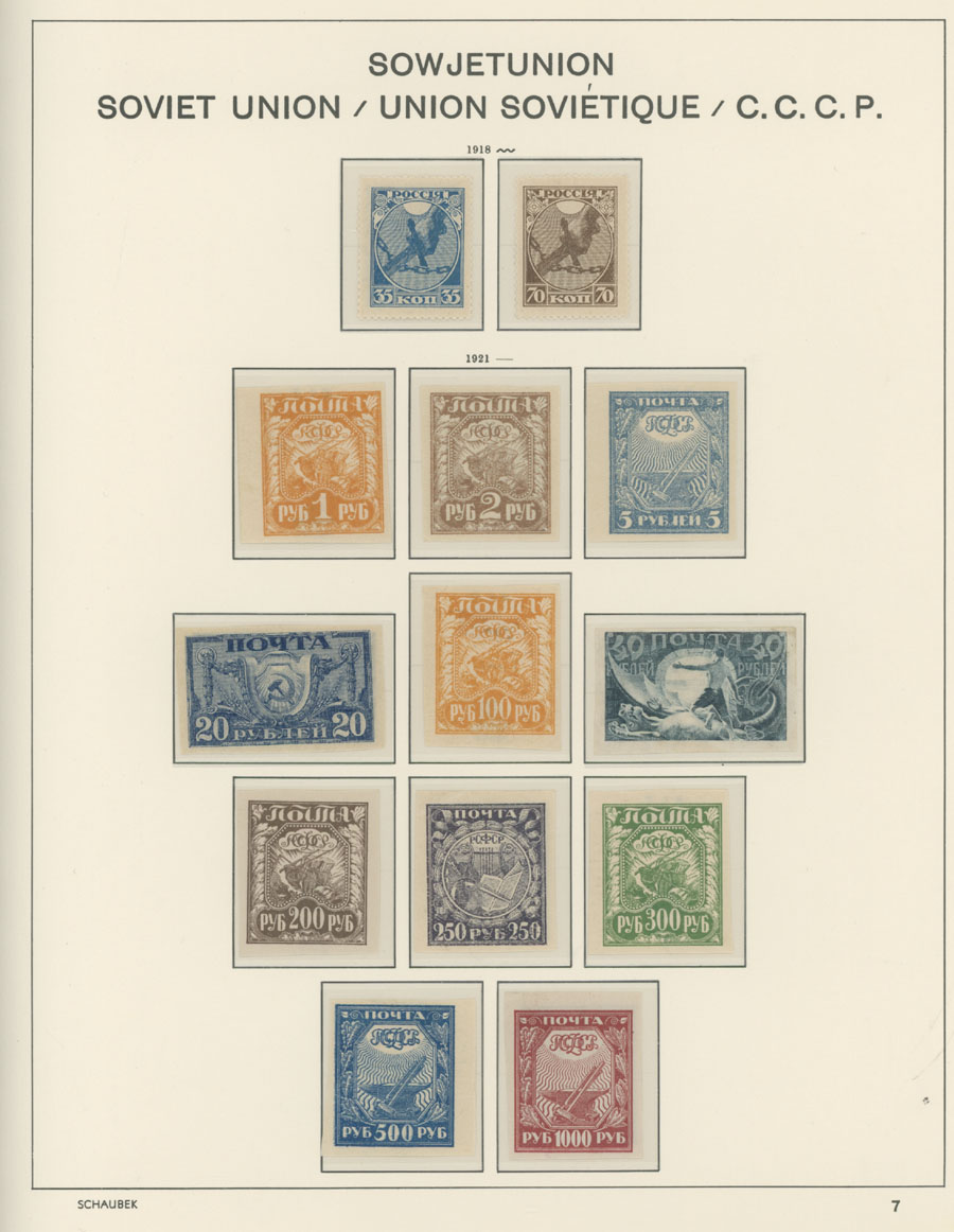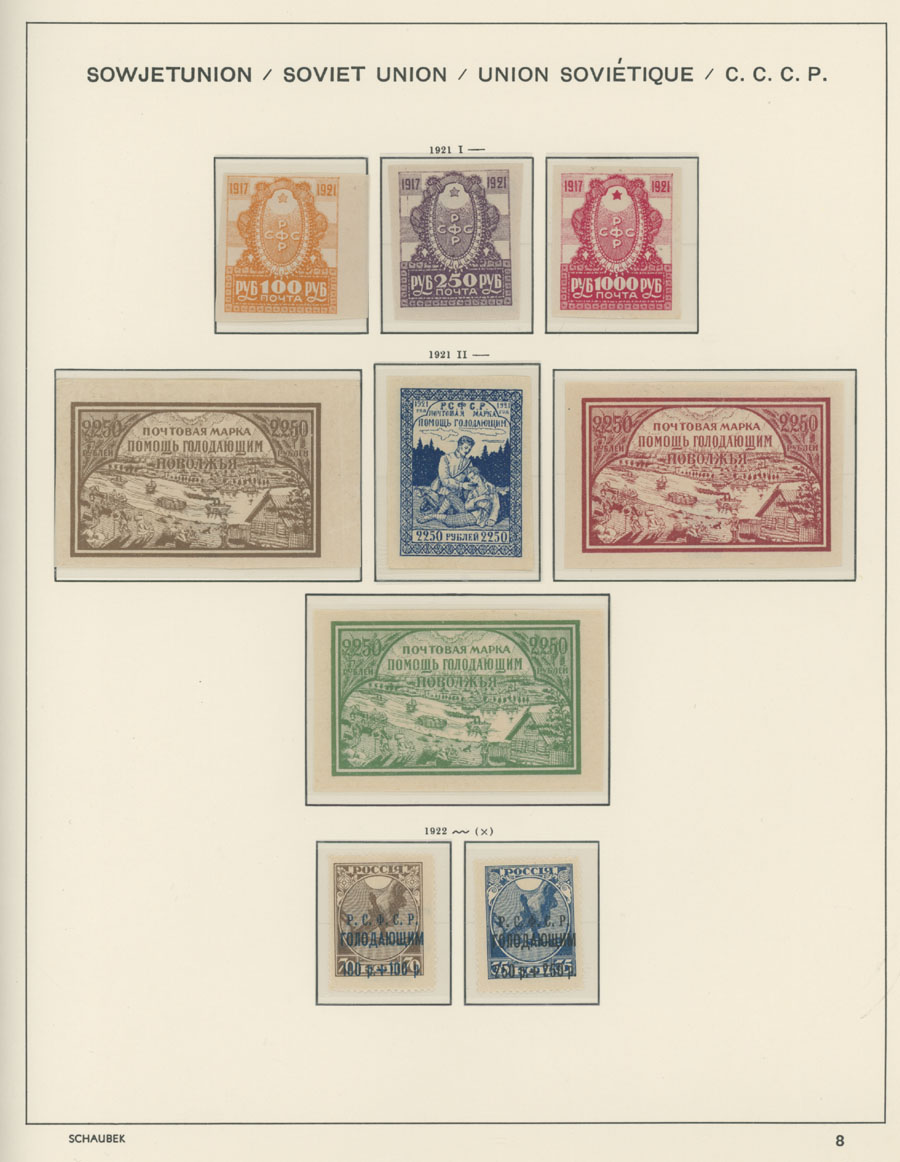 IMPERIAL RUSSIA AND R.S.F.S.R. COLLECTION ON SCHAUBEK PAGES: 1857-1923, several hundred mint and used stamps, starting with No.1 with TPO cancellation, then various sets and singles on paper without watermark or horizontally/vertically laid paper (some mixed up and valuable stamps generally used), however includes nice No.53-54, practically complete 55-70, 71, mint Romanov Dynasty with all money-stamps, complete later issues on wove paper with varnish lines even with 10k light blue (No.79a), Soviet Russia unit is apparently complete. The Collection represents semi-postal issues for the period (no Philately for the Labor); overall mixed condition on used items, full/part of OG on others, F/VF, overall high potential unit, Est. $1,200-$1,500