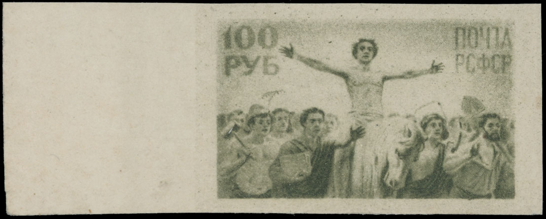 1921, ”Liberated Proletarian”, 100r olive green, left sheet margin imperforate essay of not accepted design, raster (square) printing on soft wove paper, no gum as issued, NH, VF, this design was rejected because of resemblance to the Christ figure, Est. $400-$500