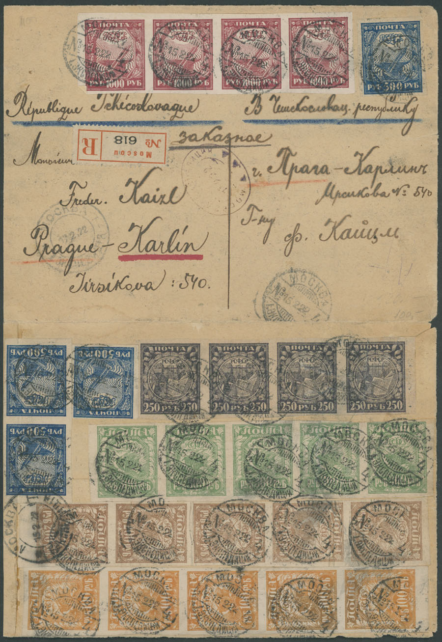 1922 (February 15), registered cover from Moscow to Prague, franked on front and reverse by 27 stamps, including 100r, 200r and 300r – 5 each, 250r, 500r ad 1000r – 4 each, cover was opened for display, mostly VF and eye-catching item, Est. $200-$350, Scott #181-86