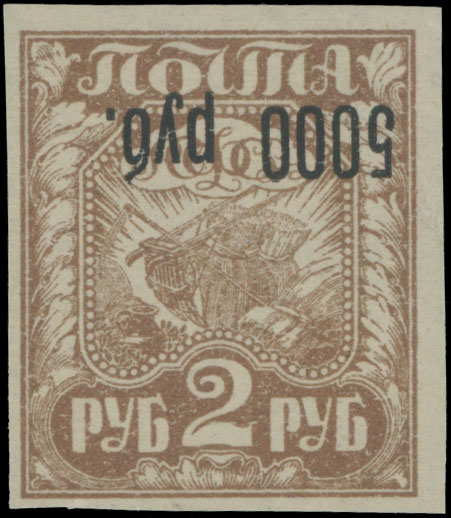 1922, inverted black surcharge 5000r on 2r light brown, full OG, NH, mostly VF, C.v. $110 as hinged, Est. $120-$150 , Scott #192a