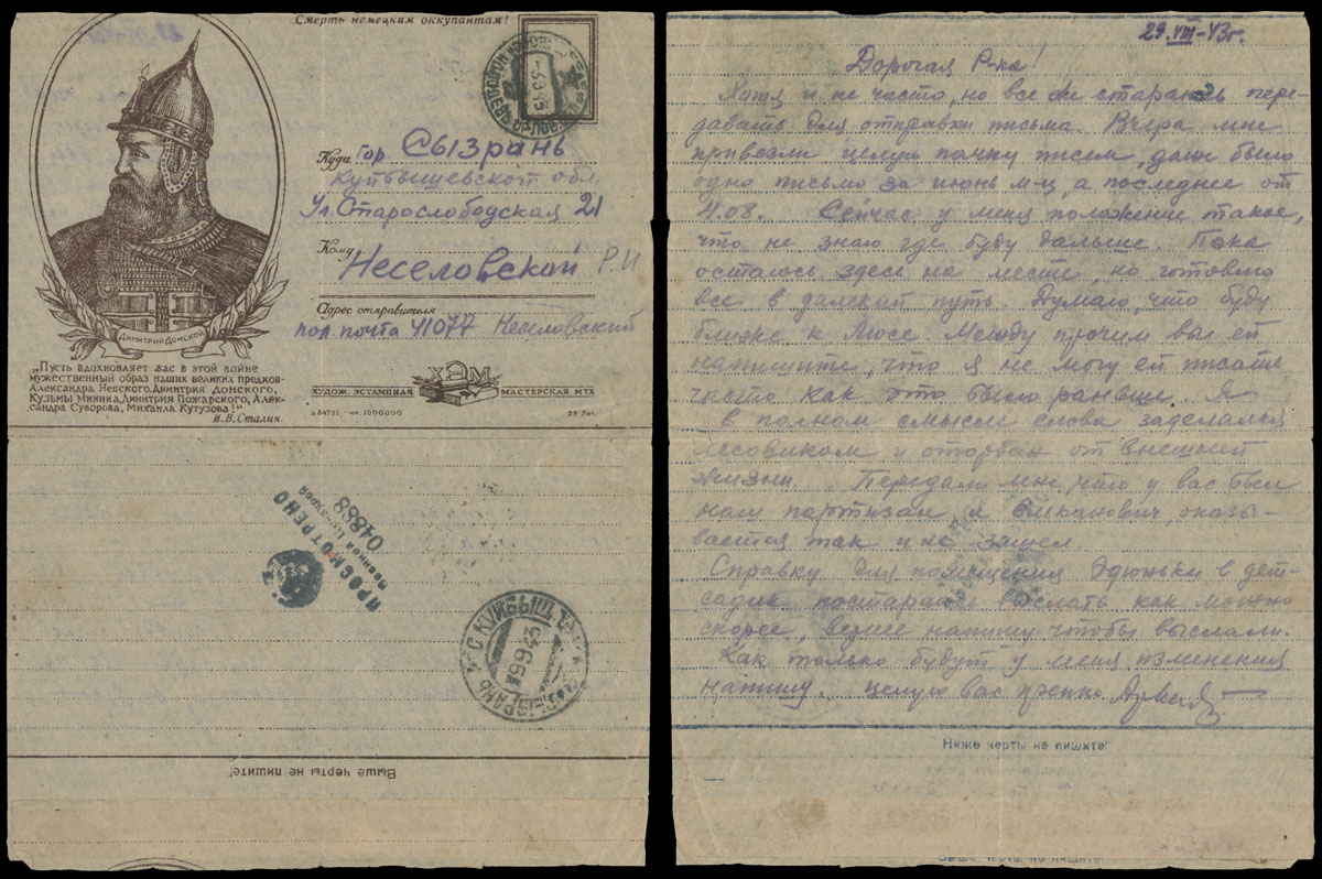 1943 (September 3), military illustrated (Dmitry Donskoy) free-frank stationery letter card, sent by Soviet Army soldier from Stanovoy Kolodez’ (Orel Obl.) to Syzran (Samara Obl.), censored with appropriate arrival, F/VF, an interesting item went through civilian post without usual field post markings, Est. $150-$180