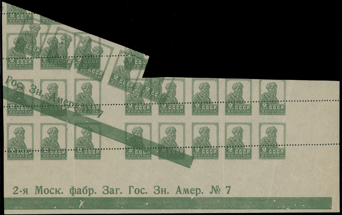 1924-25, definitive issue, peasant 2k green, typo printing, imperforate bottom right corner sheet margin irregular block of 19 (2×8 and 3 at top), 11 of which have complete or partial double impression, double control text over stamps and at bottom selvage, invalidating perforation across the design, NH, VF and a spectacular item, Est. $1,200-$1,500, Scott #277 imp