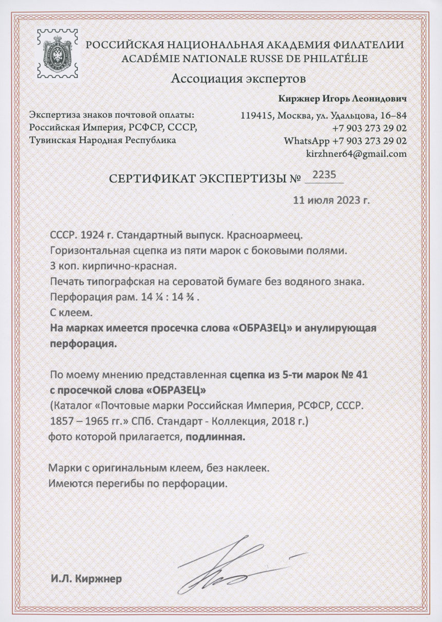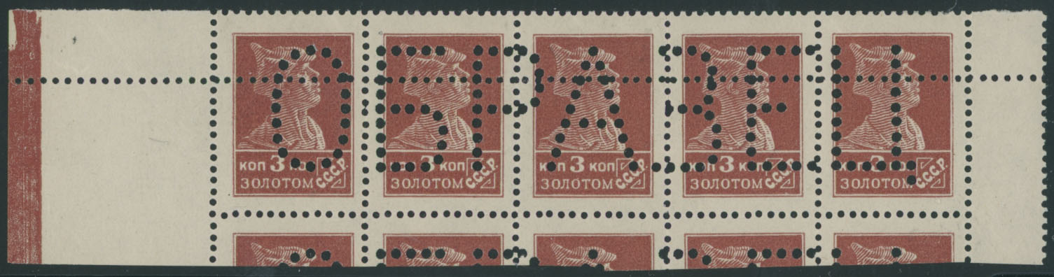 1924-25, definitive issue, soldier 3k brown red, perforation 14½x15, side margin horizontal strip of five with a part of se-tenant stamps at bottom, perfin ”OBRAZETS” (Specimen) along with invalidating perforation, printed on wove paper without watermark, full OG, NH, VF, I. Kirzhner certificate, Est. $200-$250, Scott #278