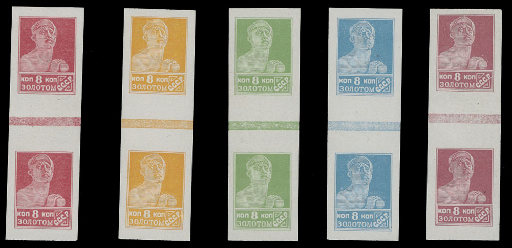 1926, definitive issue, imperforate plate proofs of 8k on chalk-surfaced paper, considered to be proofs of 8k stamp on improved paper (Standard Cat. #0121), five vertical gutter pairs in carmine, orange, yellow green, light blue and magenta, full OG, NH, VF and rare in such format, Est. $2,000-$2,500, Scott #283