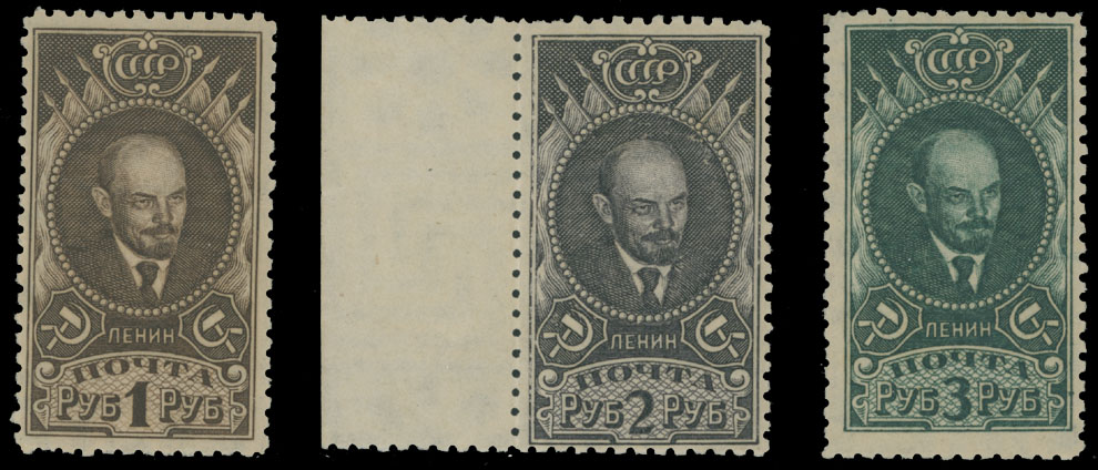 1926, Lenin, 1r dark brown, 2r dark violet and 3r dark green, complete set of three printed on watermarked Borders and Rosettes paper, full OG, NH or LH (3r), VF, C.v. $182, Est. $120-$150 , Scott #342-44
