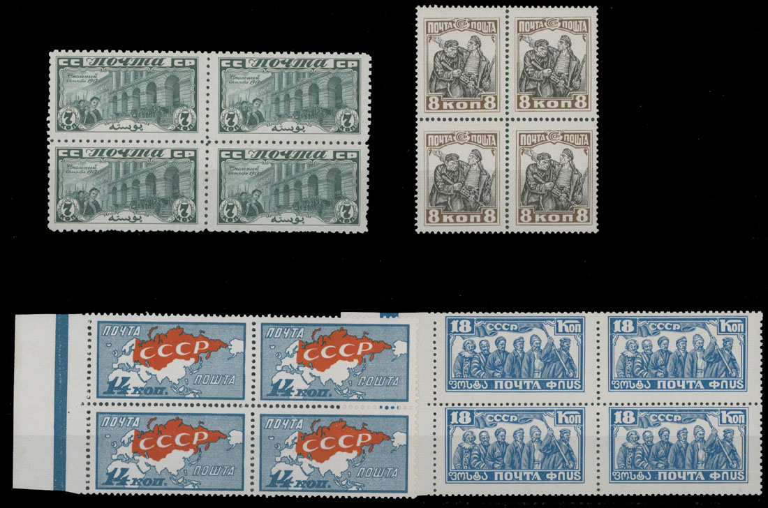 1927, 10th Anniversary of October Revolution, 7k, 8k, 14k and 18k, four stamps in blocks of four, last two with sheet margins, full OG, NH, VF, C.v. $258++, Est. $200-$250 , Scott #377-80