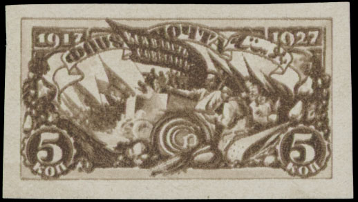 1927, 10th Anniversary of the Revolution, 5k brown, large margins imperforate single, printed on white ordinary paper (perforated stamps were printed on chalk-surfaced paper), full OG, NH, VF and rare, C.v. $2,500, Est. $1,000- $1,500 , Scott #376a
