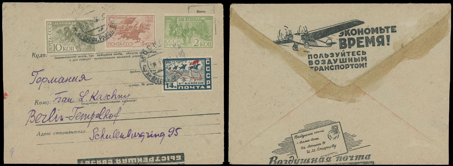 1932, stationery envelope (no indicia) with Air Mail advertising (strongly misplaced), franked by complete set of 1st Cavalry Army and sent from Moscow to Germany (no backstamp), fresh VF and an unusual item, Est. $150- $180 , Scott #431-34