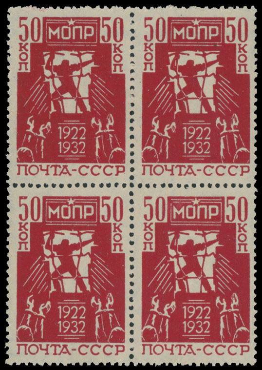 1932, M.O.P.R. (The International Organization for Aid to Revolutionary Fighters (IOPR), 50k deep red, block of four, printed on paper with vertical watermark Borders and Rosettes, full OG, NH, VF, C.v. $270++, Est. $200-$250 , Scott #479