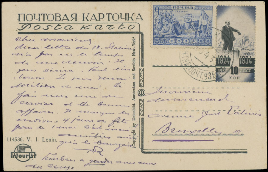 1934, real-photo postcard (Lenin in his office in Kremlin), sent from Moscow to Brussels, franked by Georgians 9k ultra and Lenin 10k black, slight corners imperfection, still VF, Est. $150-$180 , Scott #497, 543