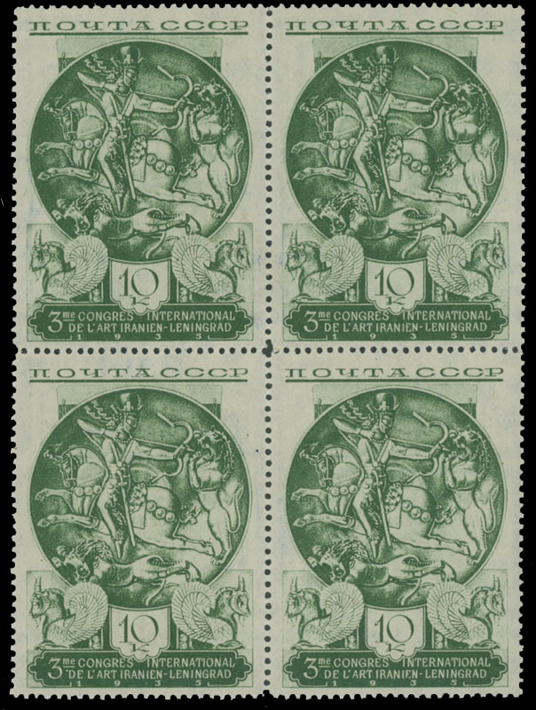 1935, Iranian Arts, 10k green, block of four printed on paper with vertical watermark Borders and Rosettes, full OG, NH, VF, C.v. $180++, Est. $150-$180 , Scott #570