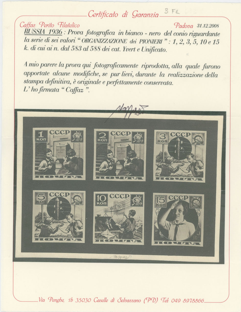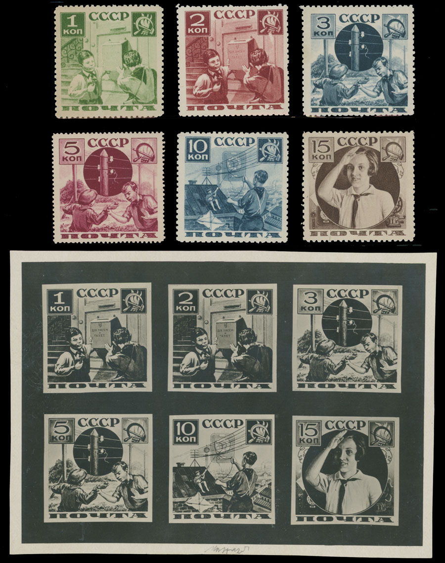 1936, Pioneers Helping Post, photo-proofs of 1k-15k in black-and white, complete set represented on a piece of postcard format,, design is stronger and clear then for issued stamps, 1k and 2k with visible ”Dlia Pisem i Gazet” (For Letters and Papers) on a mail box, other small differences presented, no gum as produced, NH, VF and very rare, an issued set is included, Caffaz certificate, Est. $1,500- $2,000, Scott #583-86