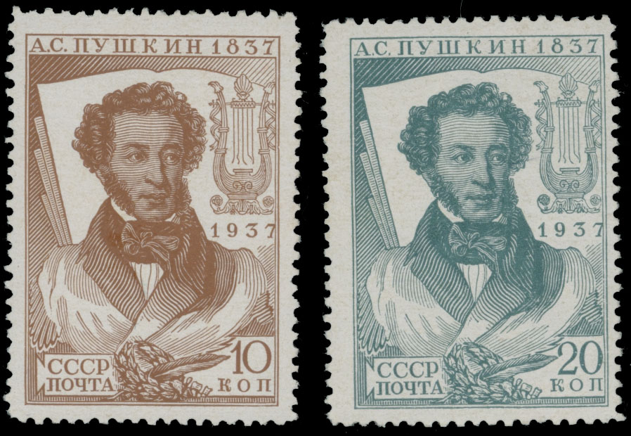1937, Alexander Pushkin, 10k yellow brown and 20k bluish green, both have perforation L14, full OG, NH, F/VF, C.v. $265, Est. $150-$180 , Scott #590D-91D