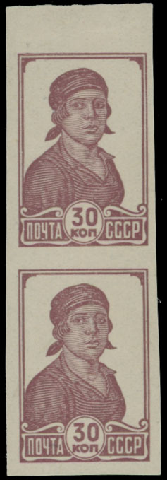 1939, definitive issue, factory worker 30k claret, top margin vertical imperforate pair, full OG, NH, VF, C.v. $1,900, Est. $800-$1,000 , Scott #618b