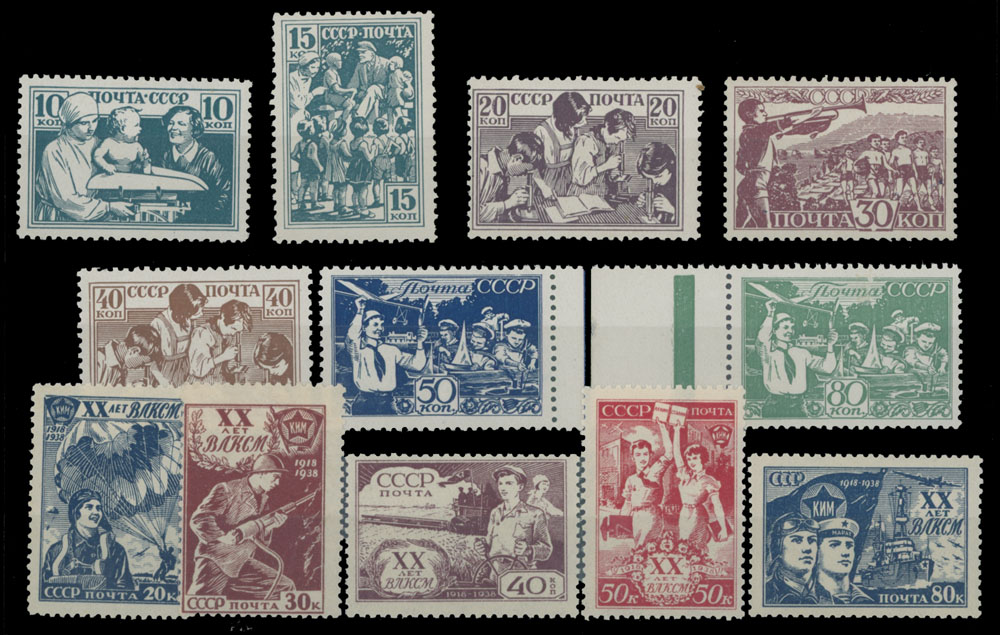 1938, Child Welfare, 10k-80k, complete set of seven; and 20th Anniversary of Youth Communist League, 20k-80k, complete set of five, both with full OG, NH, mostly VF, C.v. $287, Est. $200-$250 , Scott #659-65, 693-97