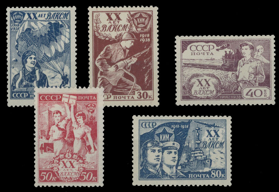1938, 20th Anniversary of the Youth Communists League, 20k-80k, complete set of five, full OG, NH, VF, C.v. $142 , Scott #693-97