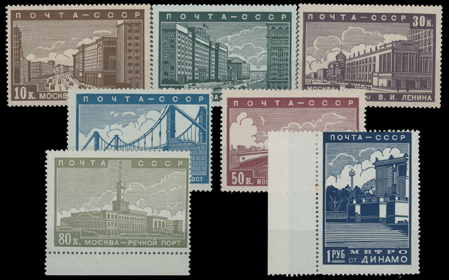 1939, Reconstruction of Moscow, 10k-1r, complete set of seven, high values with sheet margins, full OG (minor disturbing spot at bottom of 1r), NH, F/VF, C.v. $255, Est. $150-$180 , Scott #706-12