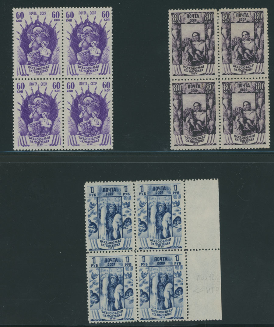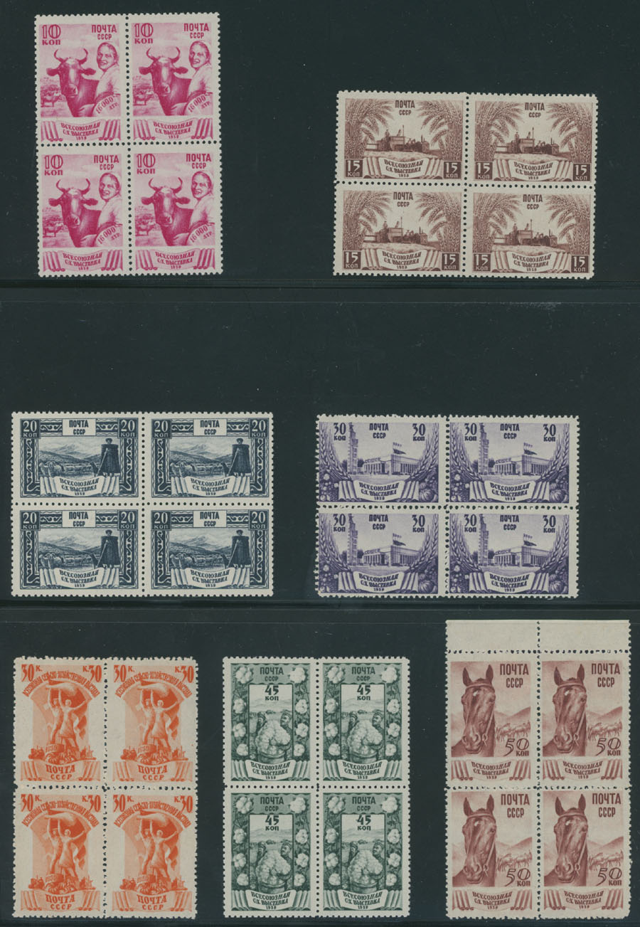 1939, Agriculture Fair, 10k-1r, complete set of ten, 10k, 15k, 20k and 60k with comb perforation, blocks of four, full OG, NH, F/VF, C.v. $512++, Est. $300-$400 , Scott #724-33