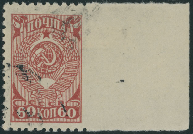 1943, Coat of Arms, 60k pale red, right sheet margin single imperforate on the right, some ink cancellation soiling, F/VF, Est. $250-$300 , Scott #737 var
