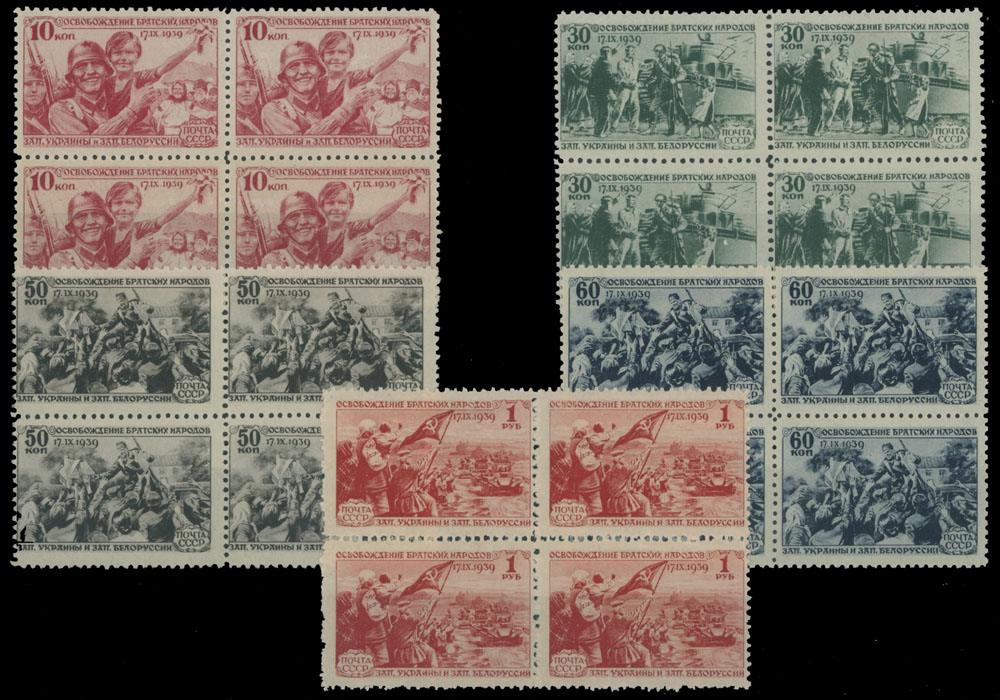 1940, ”Liberation” of Western Ukraine and Western Byelorussia, 10k-1r, complete set of five, blocks of four, full original gum slightly dried on 10k and 1r, NH, mostly VF, C.v. $240++, Est. $200-$250 , Scott #767-71