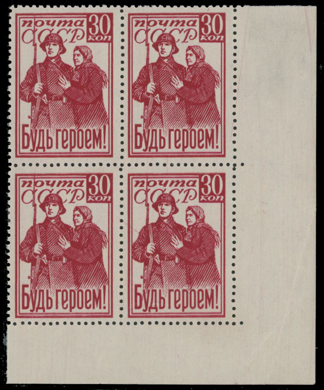 1941, ”Be a Hero!”, 30k carmine, bottom right corner sheet margin block of four, slight edge fold far away from the stamps, full OG, NH, VF, C.v. $140++, Est. $150-$180 , Scott #856