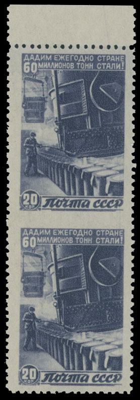 1946, Steel Smelting, 20k dark blue violet, top sheet margin vertical pair, imperforate between stamps, full OG, NH, VF, Est. $250-$300 , Scott #1078 var