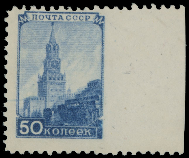 1948, definitive issue, Spasski Tower, 50k bright blue, right sheet margin single, imperforate between stamp and margin, full OG, NH, F/VF, Est. $300-$400 , Scott #1220 var