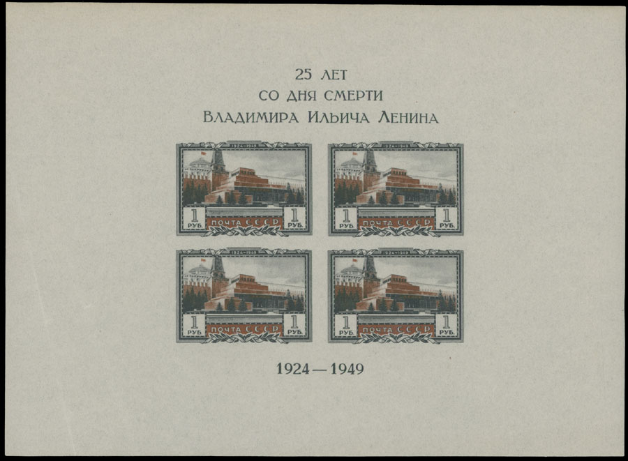 1949, Lenin Mausoleum, 1r brownish red and greenish black, imperforate souvenir sheet of four stamps, size 178x131mm, full original gum with minor usual wrinkles, LH, VF, C.v. $975, Est. $600-$700 , Scott #1327a imp