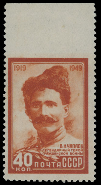 1949, Vassily Chapayev, 40k brownish orange, early printing, upper margin single, imperforate at the top, full OG, NH, VF, Est. $250-$300 , Scott #1403 var