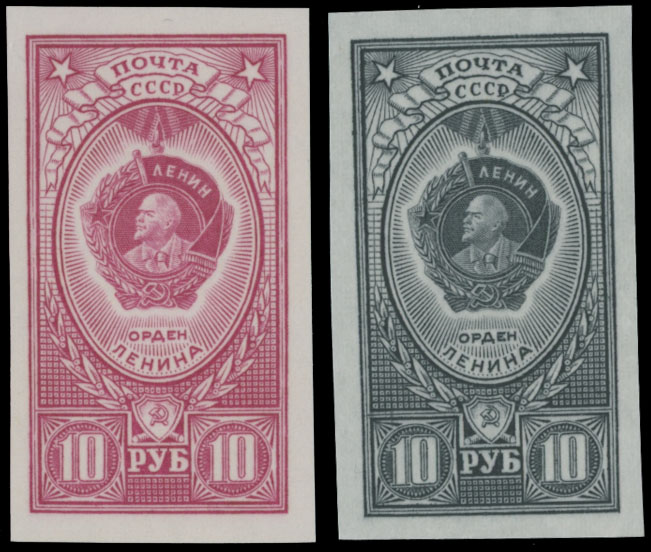 1952, Order of Lenin, two imperforate plate proofs of 10r in rose (issued color for original issue) and black, printed on wove paper without watermark, no gum as produced, NH, VF and rare, Est. $500-$600 , Scott #1654