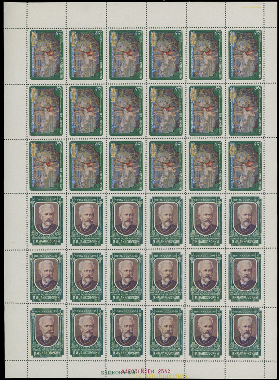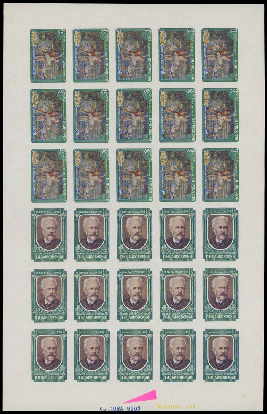 1958, Pyotr I. Tchaikovsky, 40k multicolored, perforated and imperforate complete sheets of 36 and 30, containing 18 and 15 stamps of Swan Lake and 18 and 15 stamps of Tchaikovsky portrait, including six or five se-tenant pairs respectively, full OG, NH, VF, Est. $150-$180, Scott #2044-45, imp