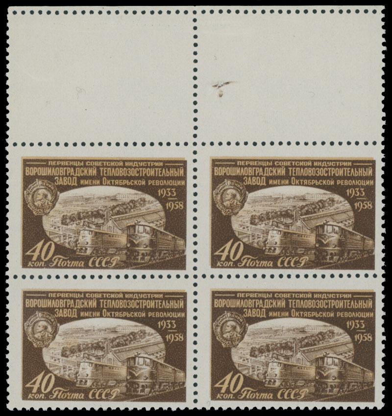 1958, Voroshilovgrad Locomotive Plant, 40k brown and buff, unissued stamp due to changing city name from Voroshilovgrad to Lugansk at that time, block of four with two plain labels at the top, control pinhole on the right label, full OG, NH, VF and rare multiple, Est. $2,000-$2,500, Scott #2118 fn